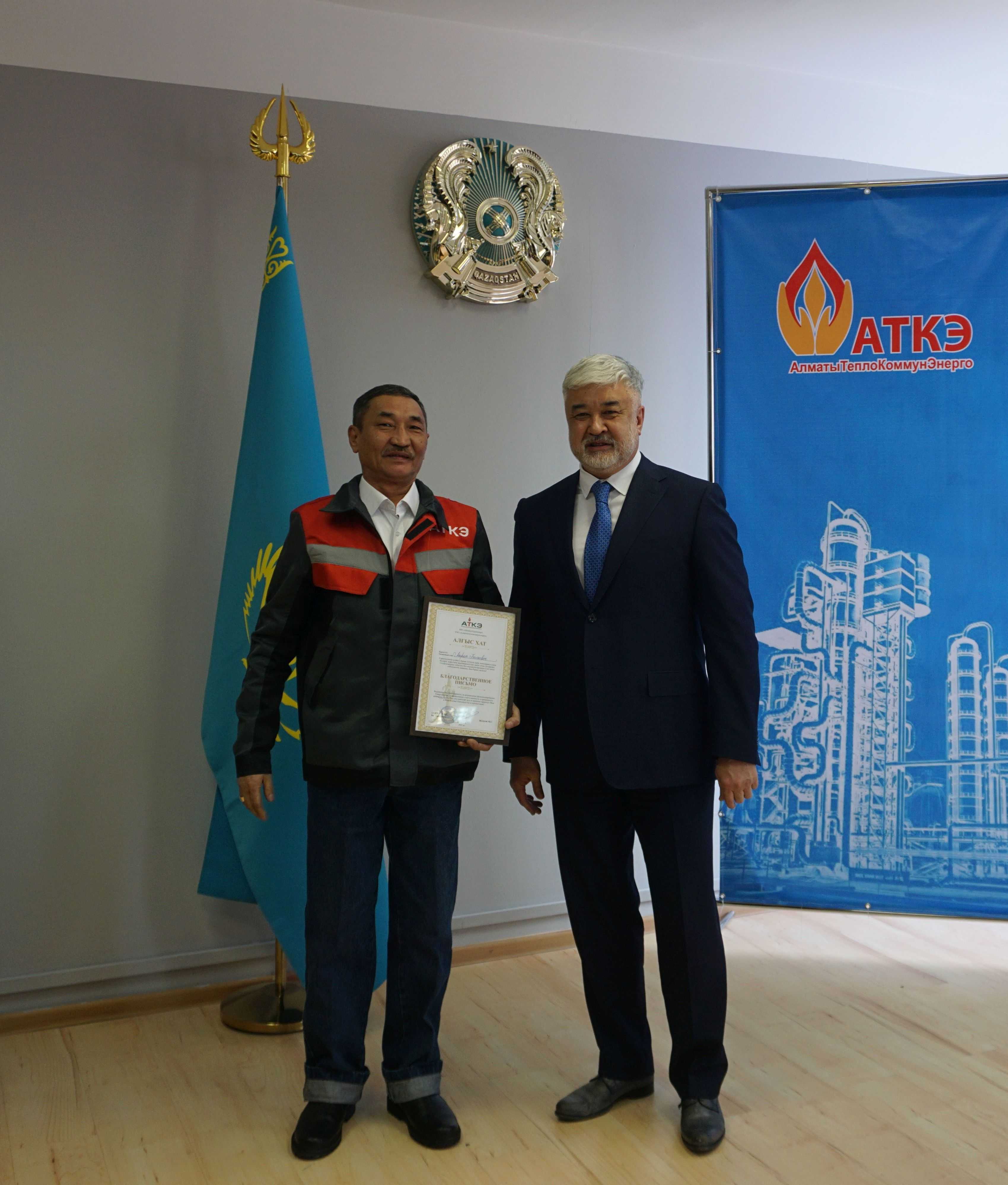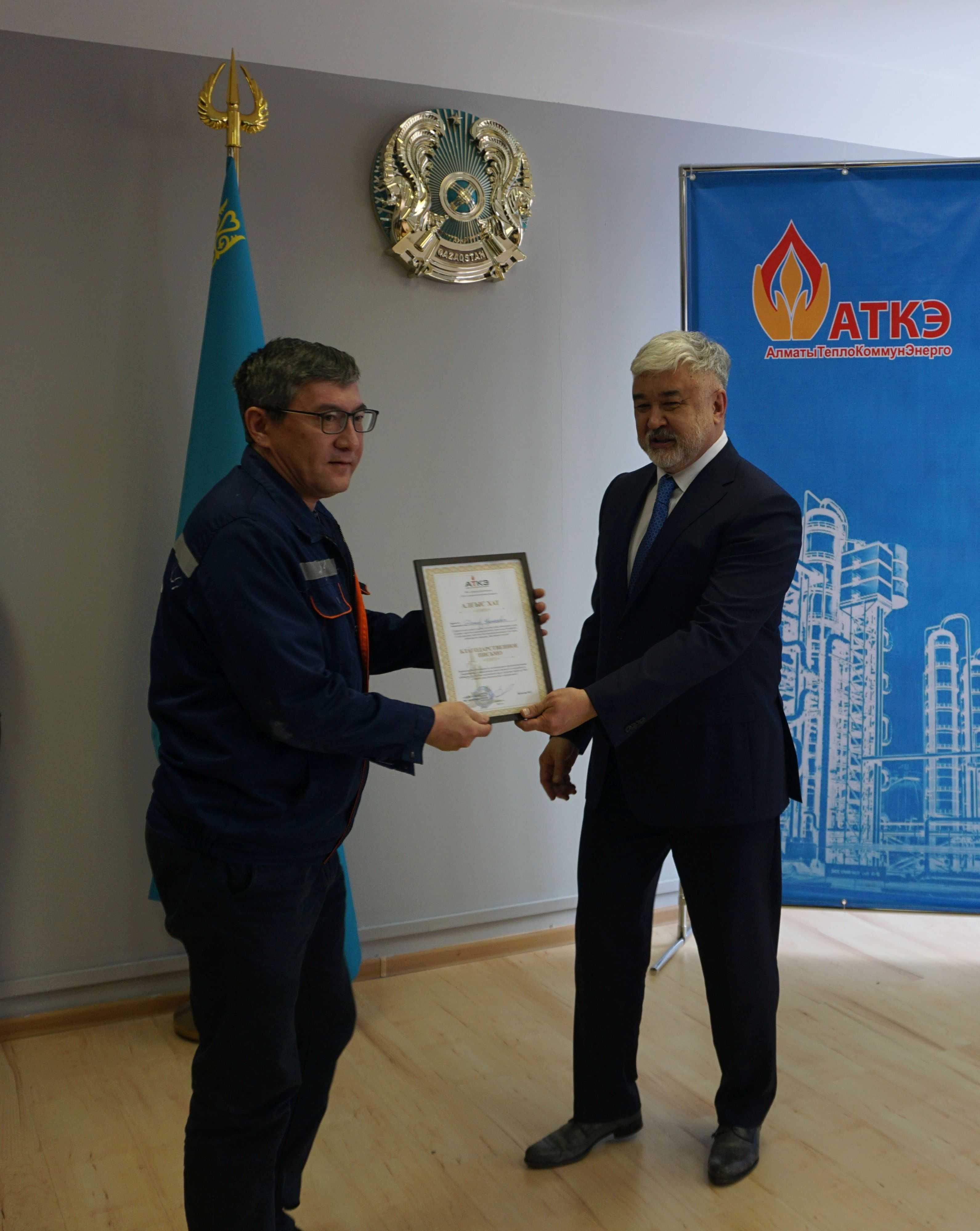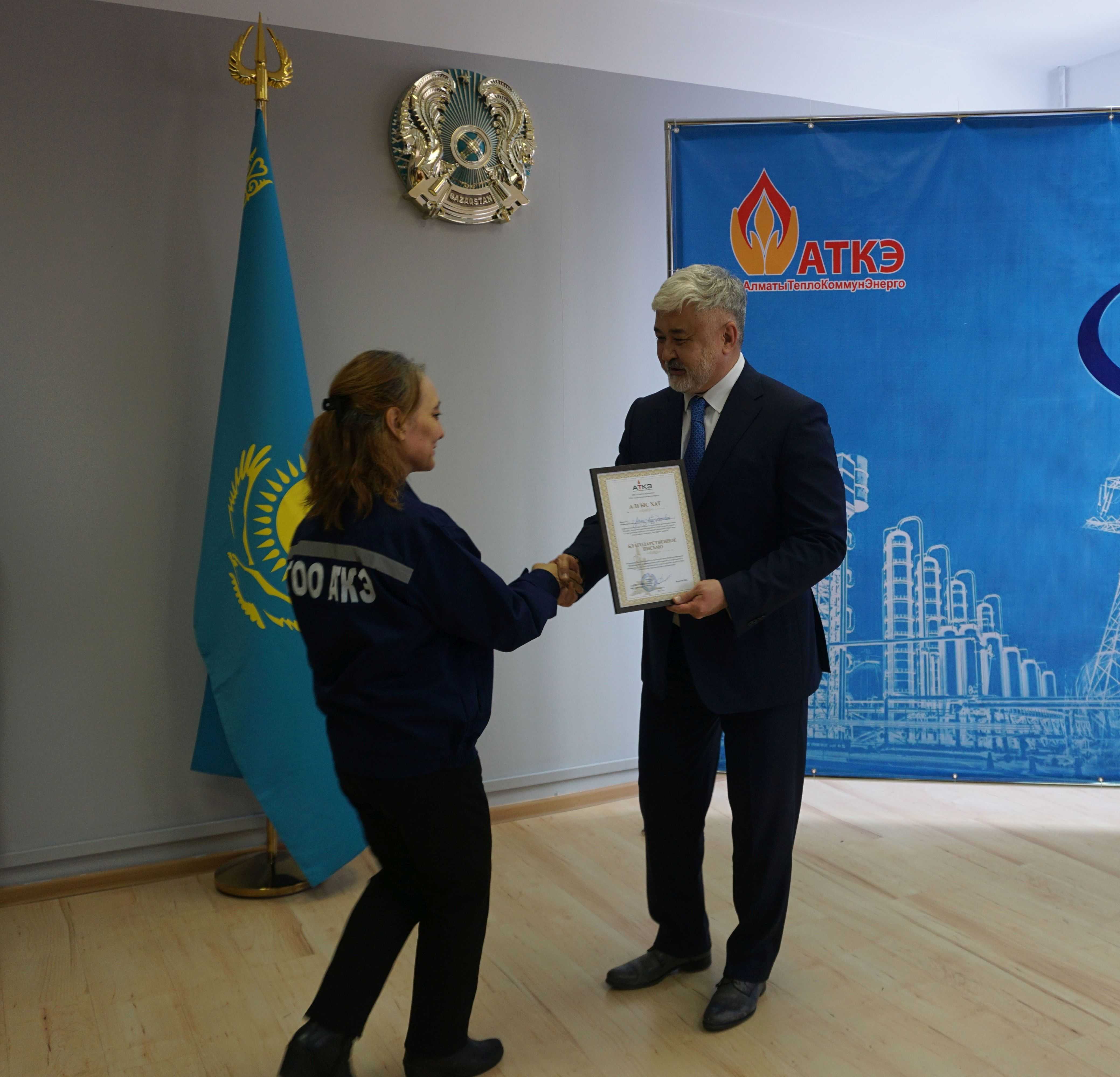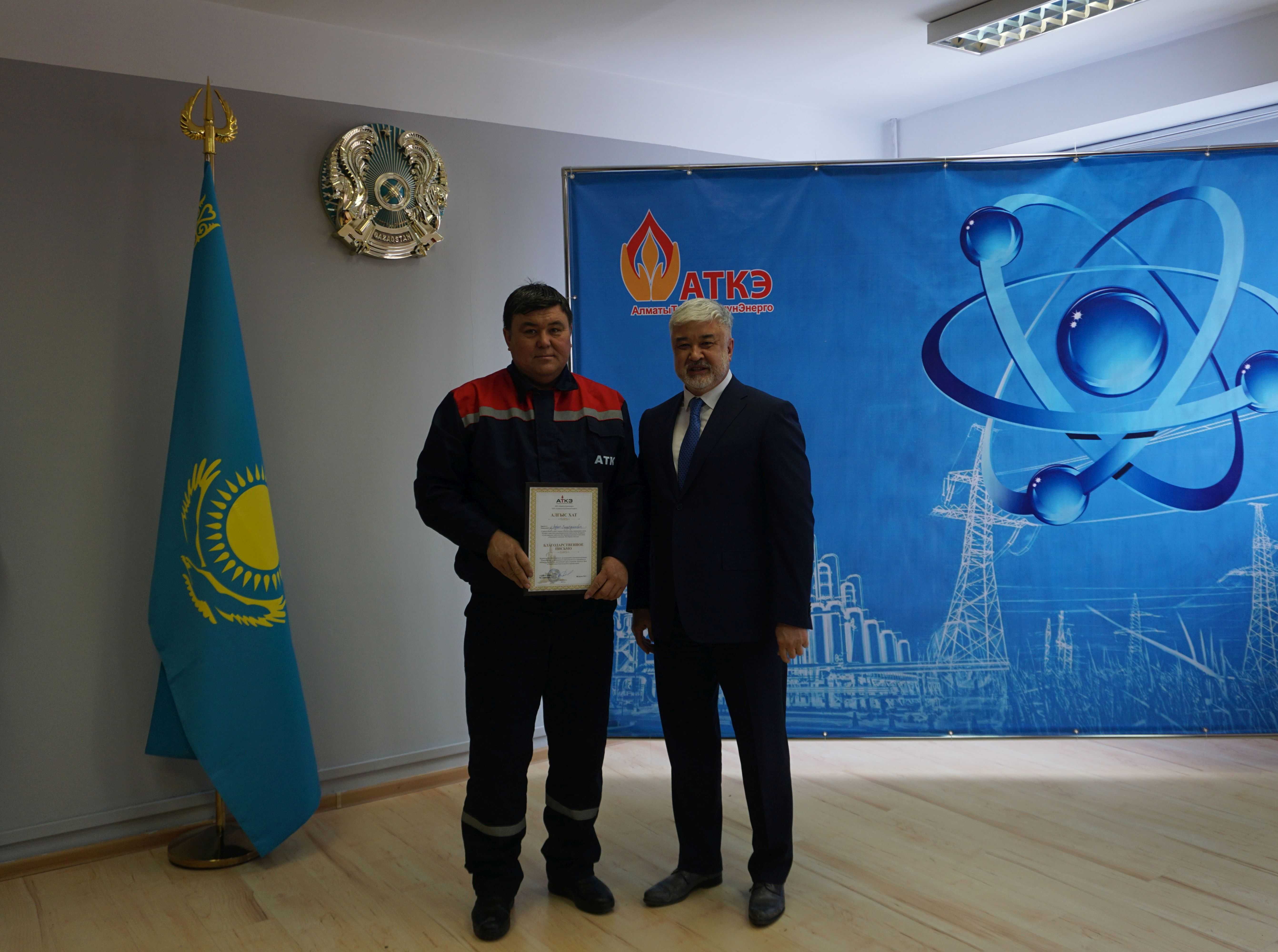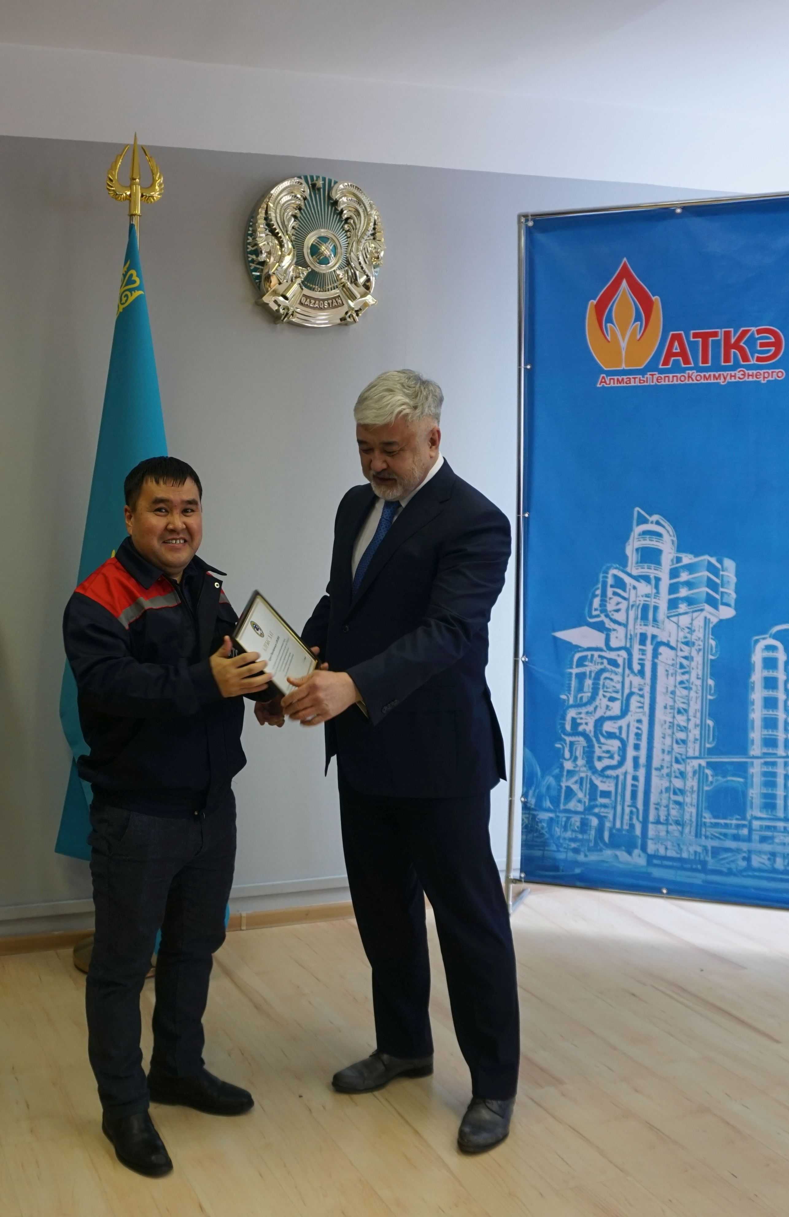 На церемонии были вручены нагрудные знаки РК от Министерства энергетики  «Еңбек сіңірген энергетик», «Құрметті энергетик», почетные грамоты и благодарственные письма от акимата города Алматы , КГУ «Управления энергетики и водоснабжения г. Алматы» и ТОО “Алматытеплокоммунэнерго”. Поздравили и наградили сотрудников за высокое профессиональное мастерство и личный вклад в развитие предприятия руководитель управления энергетики и водоснабжения города Алматы -Алин С.М. , генеральный директор ТОО “АТКЭ”- Жунусов М.С. , главный инженер ТОО “АТКЭ” - Дюсенов С.О., заместитель генерального директора по экономике и финансам ТОО “АТКЭ” - Иппергенов Т.С., заместитель генерального директора по обеспечению производства ТОО “АТКЭ”  - Нугарбеков Д.К., Заместитель главного инженера ТОО “АТКЭ” - Леденцов П.А.