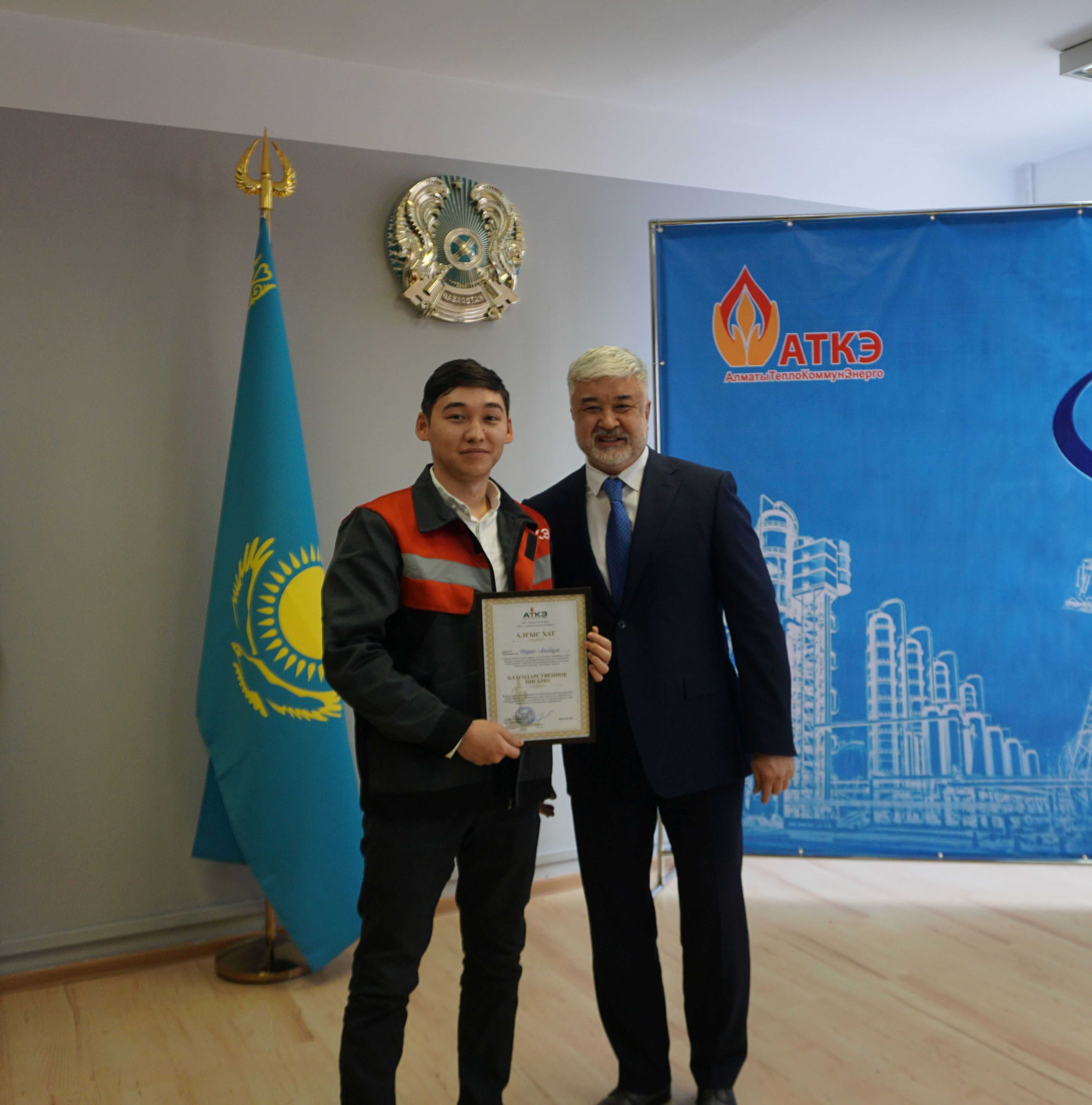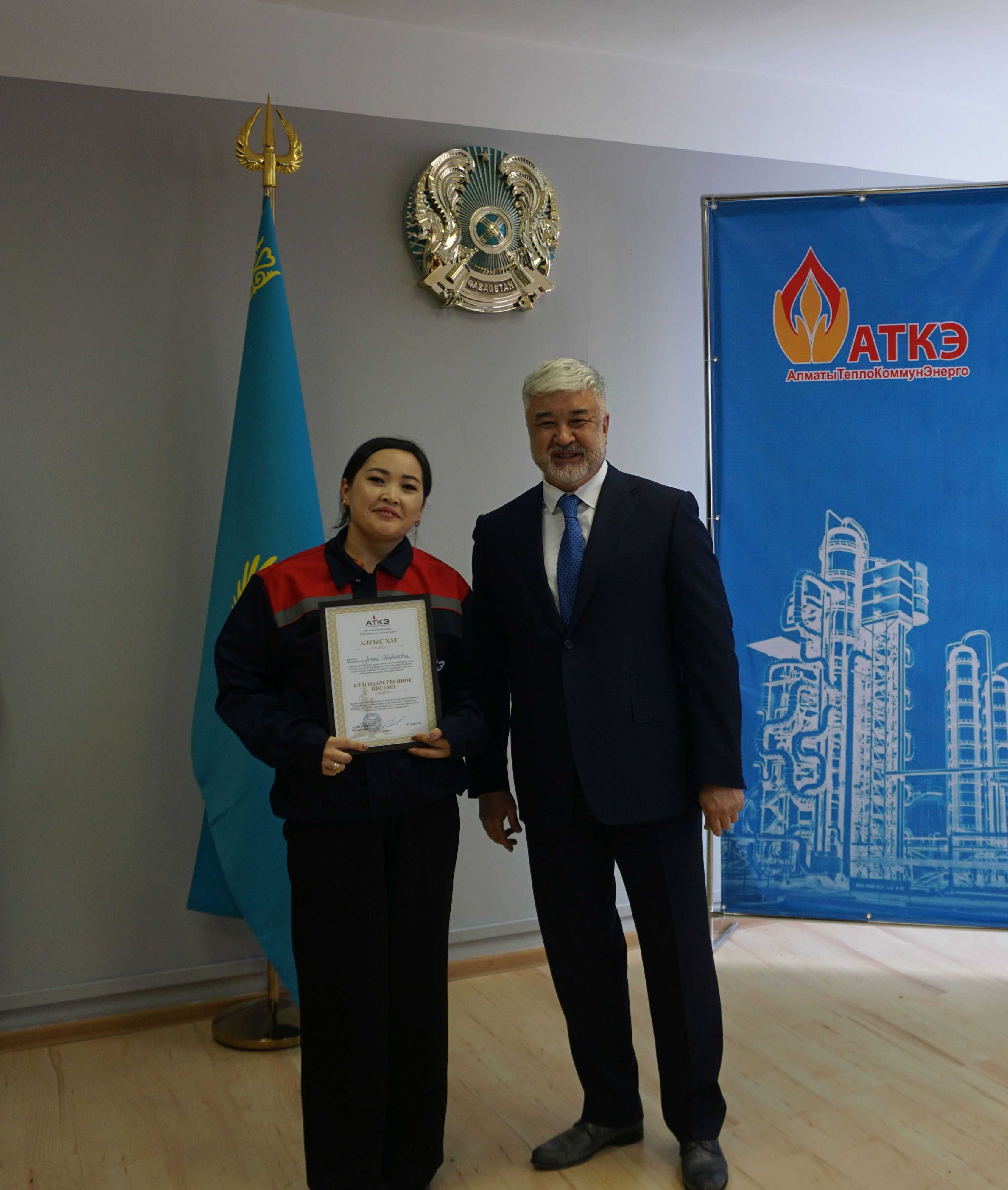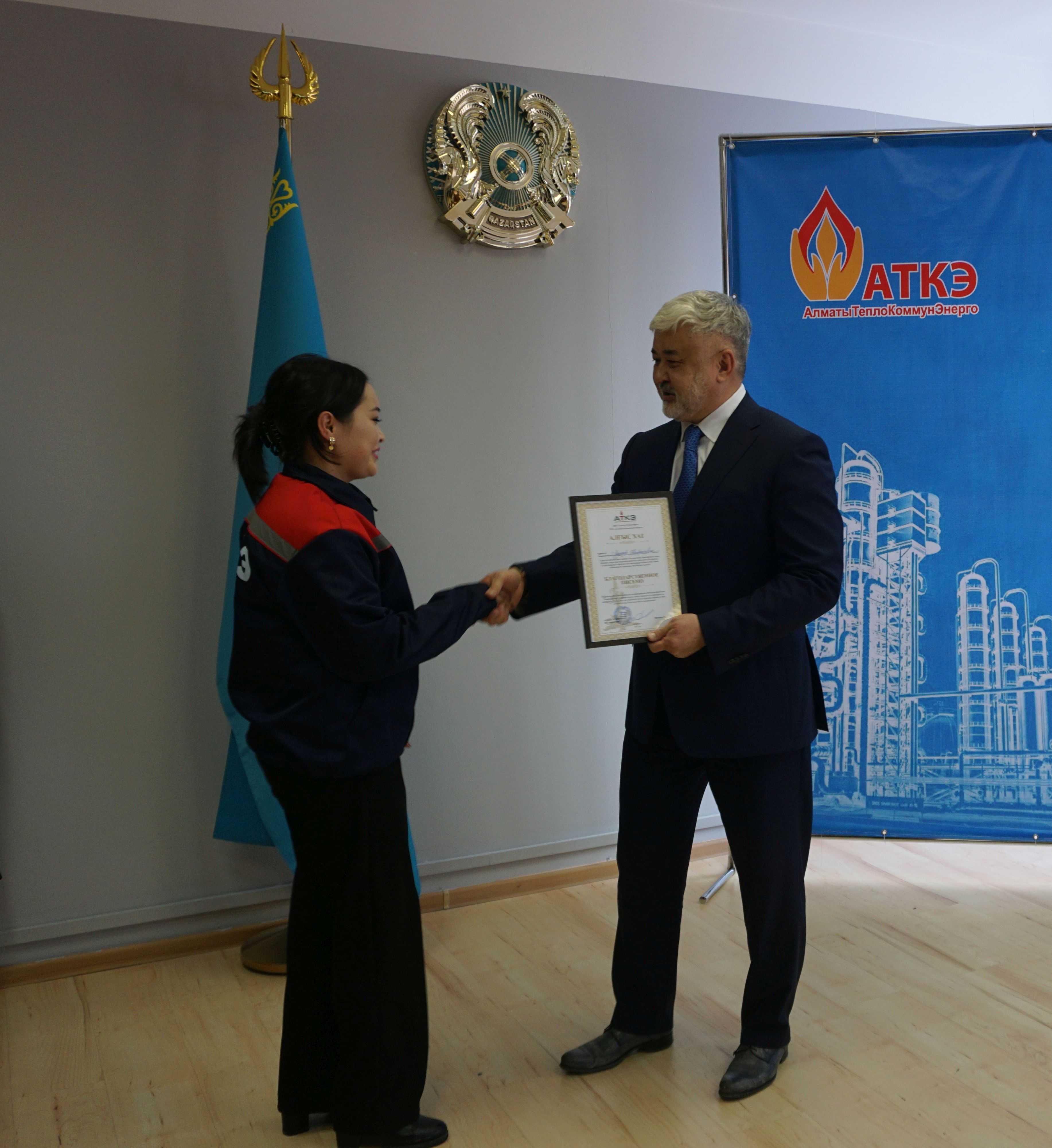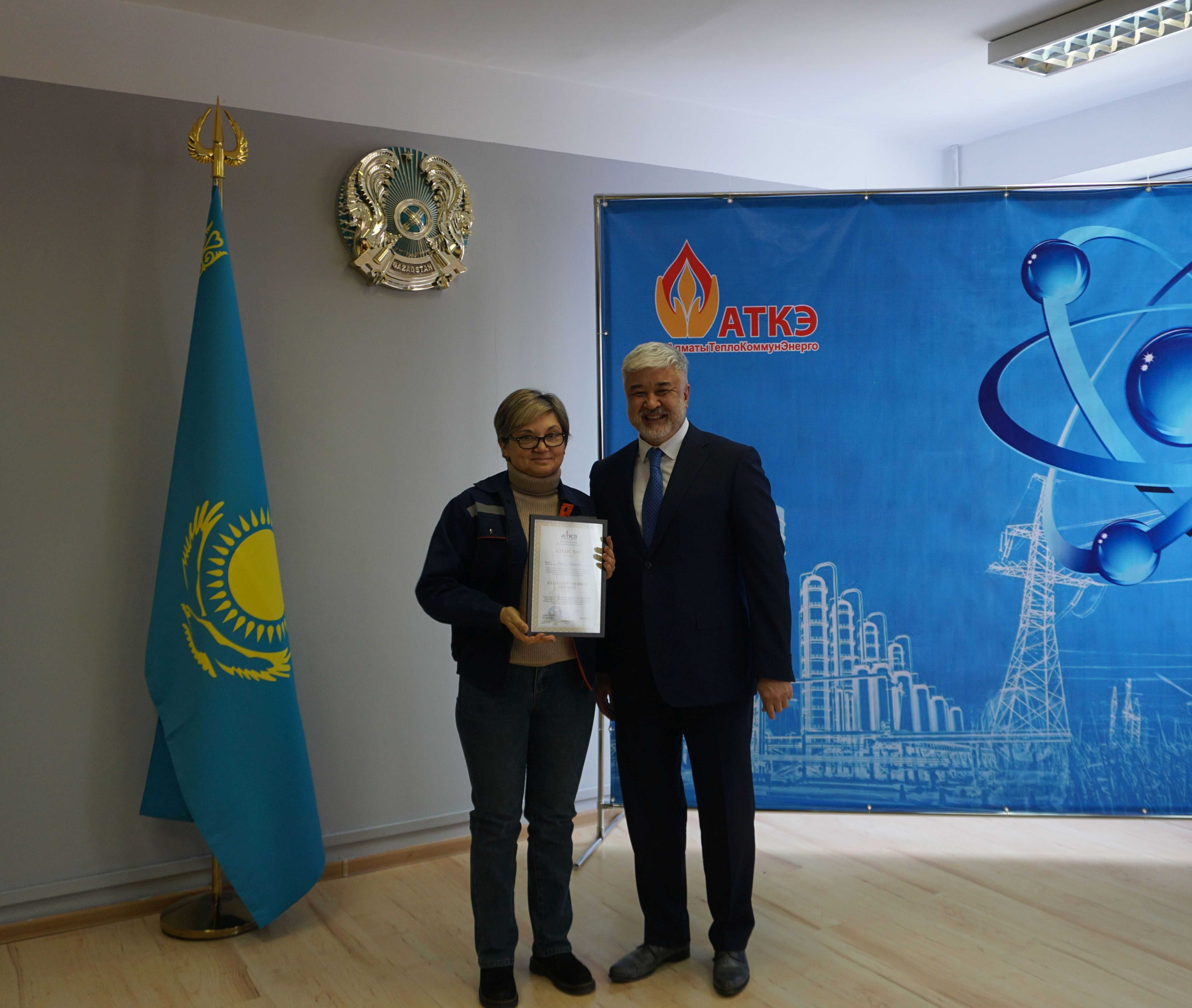 На церемонии были вручены нагрудные знаки РК от Министерства энергетики  «Еңбек сіңірген энергетик», «Құрметті энергетик», почетные грамоты и благодарственные письма от акимата города Алматы , КГУ «Управления энергетики и водоснабжения г. Алматы» и ТОО “Алматытеплокоммунэнерго”. Поздравили и наградили сотрудников за высокое профессиональное мастерство и личный вклад в развитие предприятия руководитель управления энергетики и водоснабжения города Алматы -Алин С.М. , генеральный директор ТОО “АТКЭ”- Жунусов М.С. , главный инженер ТОО “АТКЭ” - Дюсенов С.О., заместитель генерального директора по экономике и финансам ТОО “АТКЭ” - Иппергенов Т.С., заместитель генерального директора по обеспечению производства ТОО “АТКЭ”  - Нугарбеков Д.К., Заместитель главного инженера ТОО “АТКЭ” - Леденцов П.А.