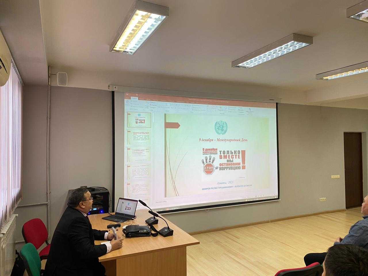 28.11.2023 года совместно с представителями "Департамента Агентства Республики Казахстан по противодействию коррупции (Антикоррупционной службы) по городу Алматы" была проведена лекция на тему Концепция антикоррупционной политики РК на 2022-2026 гг,, коррупционные риски в сфере государственных закупок в субъектах квазигосударственного сектора.