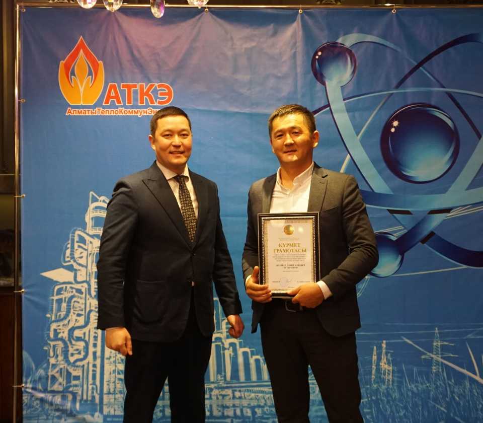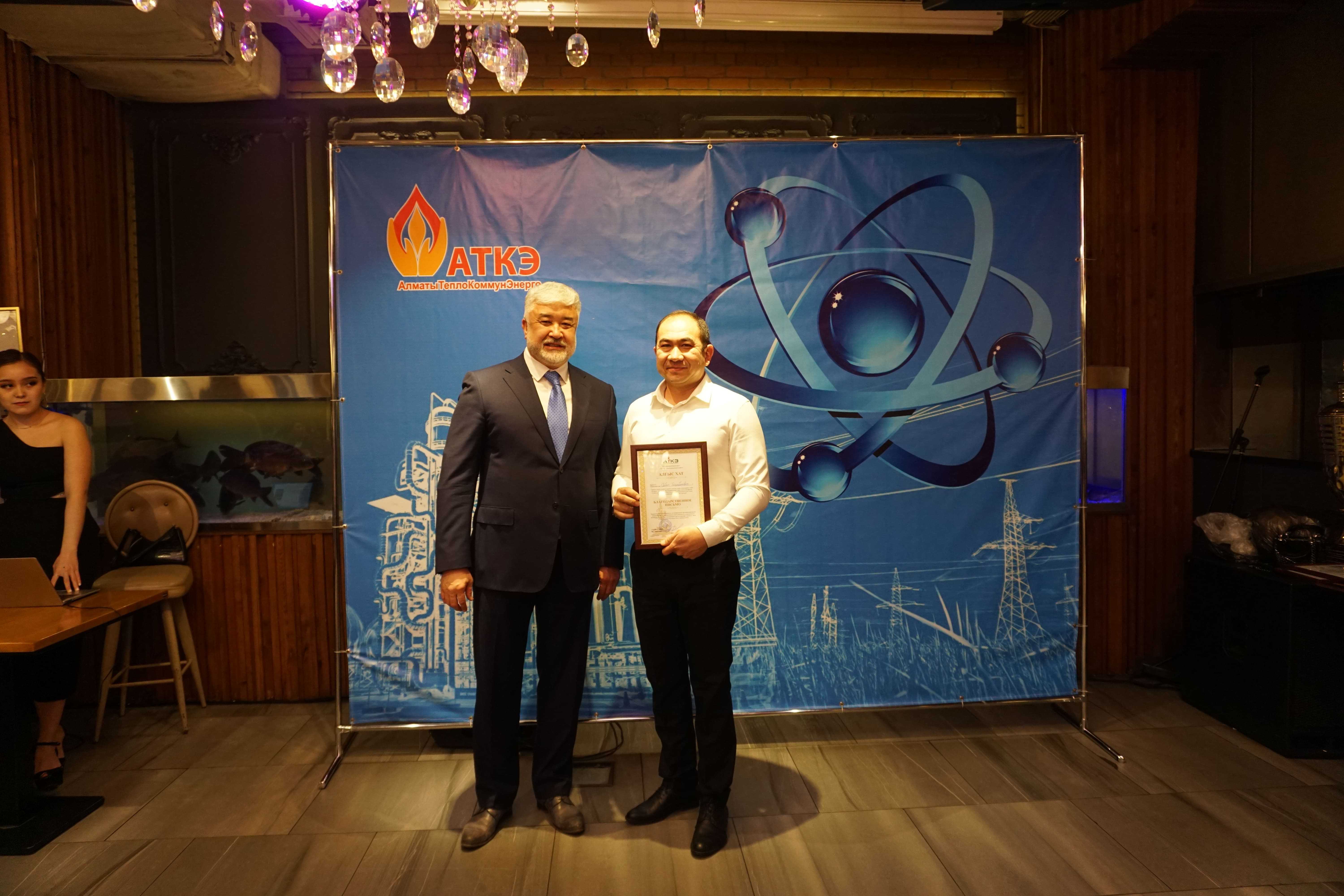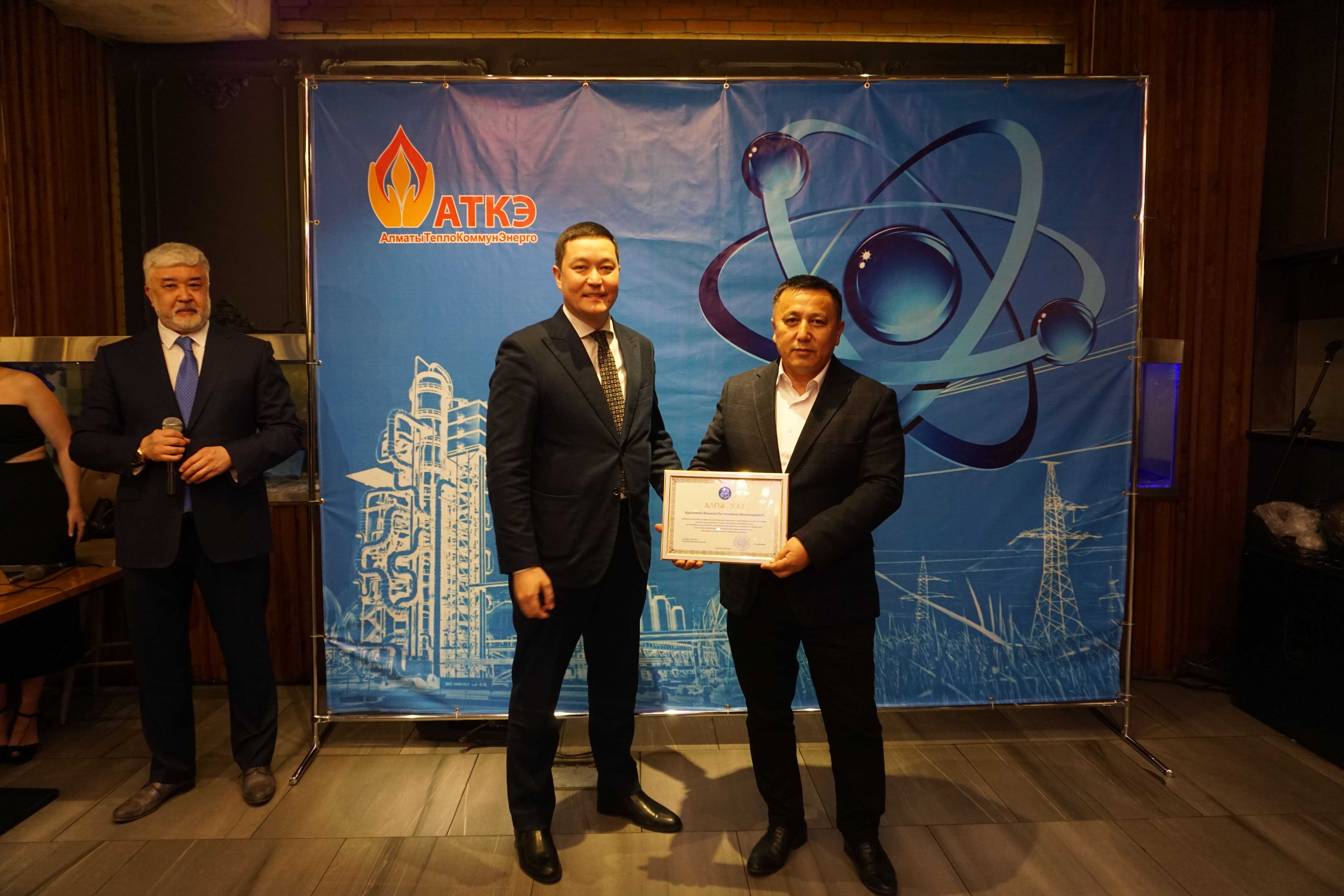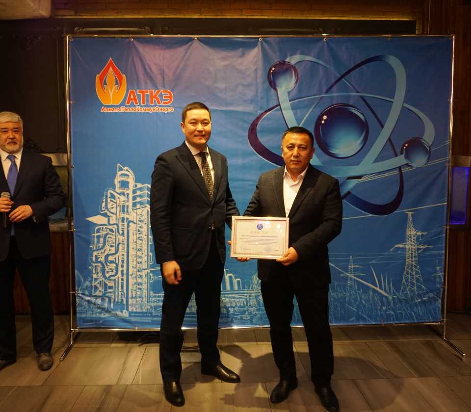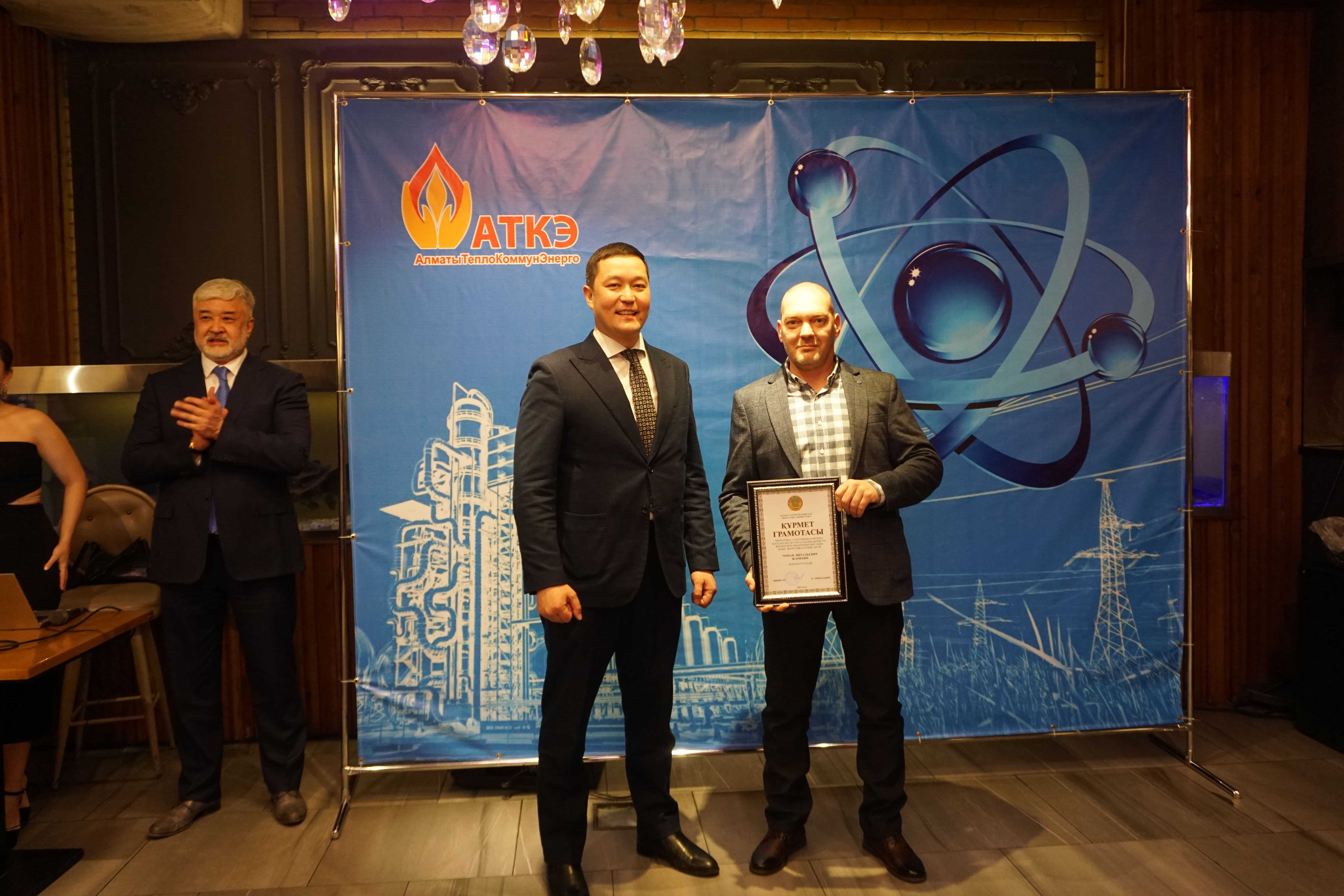 На церемонии были вручены нагрудные знаки РК от Министерства энергетики «Еңбек сіңірген энергетик», «Құрметті энергетик», почетные грамоты и благодарственные письма от акимата города Алматы , КГУ «Управления энергетики и водоснабжения г. Алматы» и ТОО “Алматытеплокоммунэнерго”. Поздравили и наградили сотрудников за высокое профессиональное мастерство и личный вклад в развитие предприятия руководитель управления энергетики и водоснабжения города Алматы -Алин С.М. , генеральный директор ТОО “АТКЭ”- Жунусов М.С. , главный инженер ТОО “АТКЭ” - Дюсенов С.О., заместитель генерального директора по экономике и финансам ТОО “АТКЭ” - Иппергенов Т.С., заместитель генерального директора по обеспечению производства ТОО “АТКЭ” - Нугарбеков Д.К., Заместитель главного инженера ТОО “АТКЭ” - Леденцов П.А.