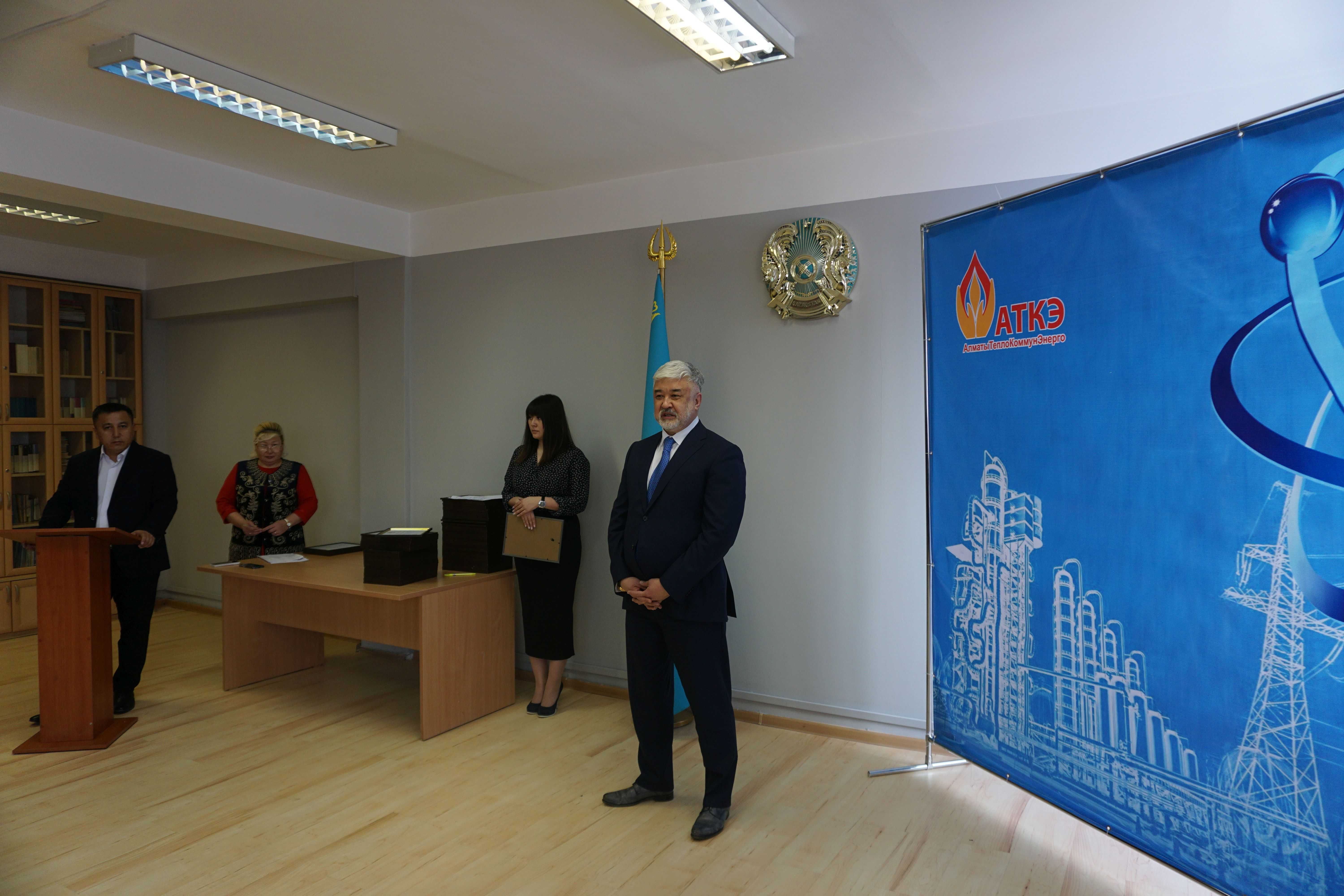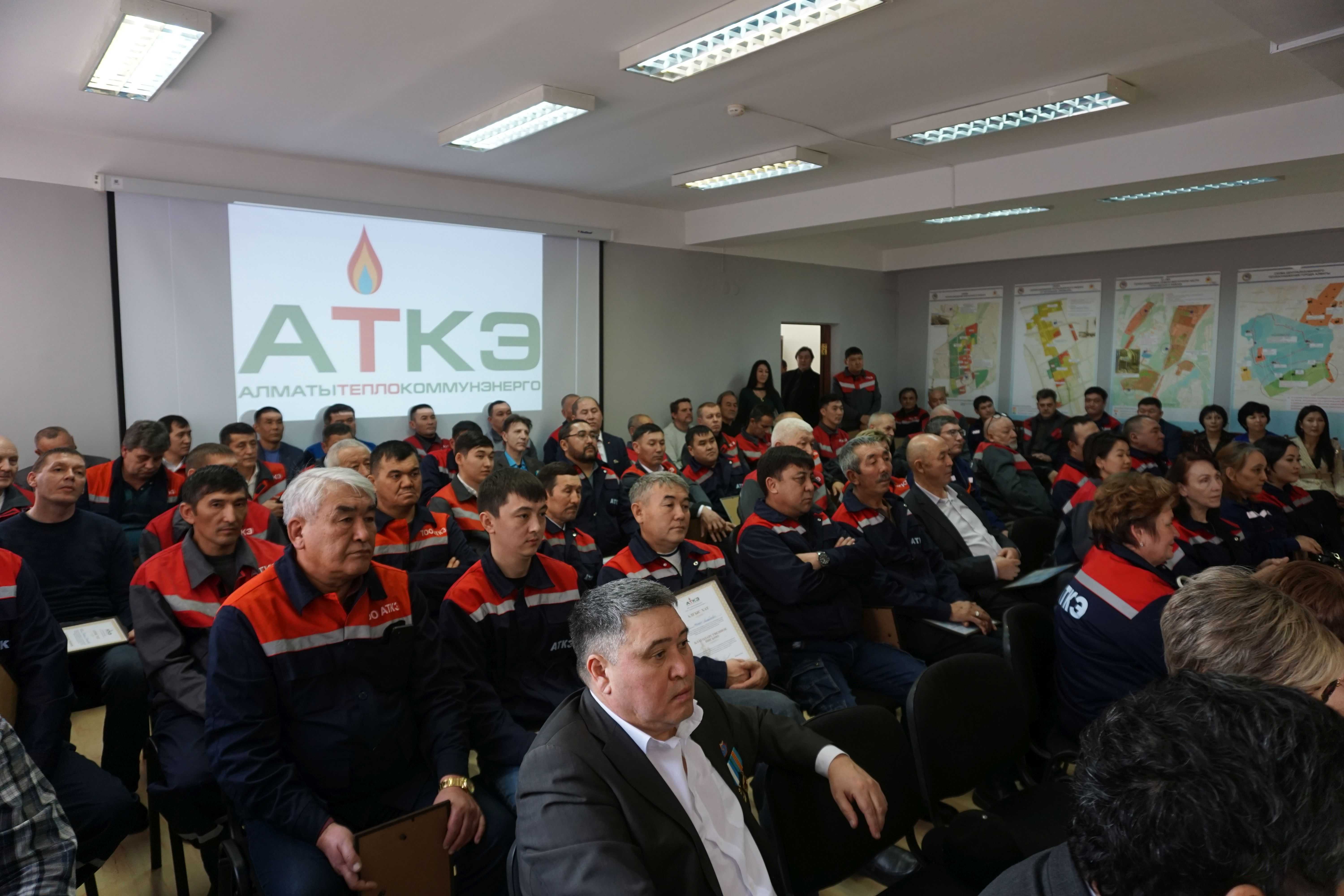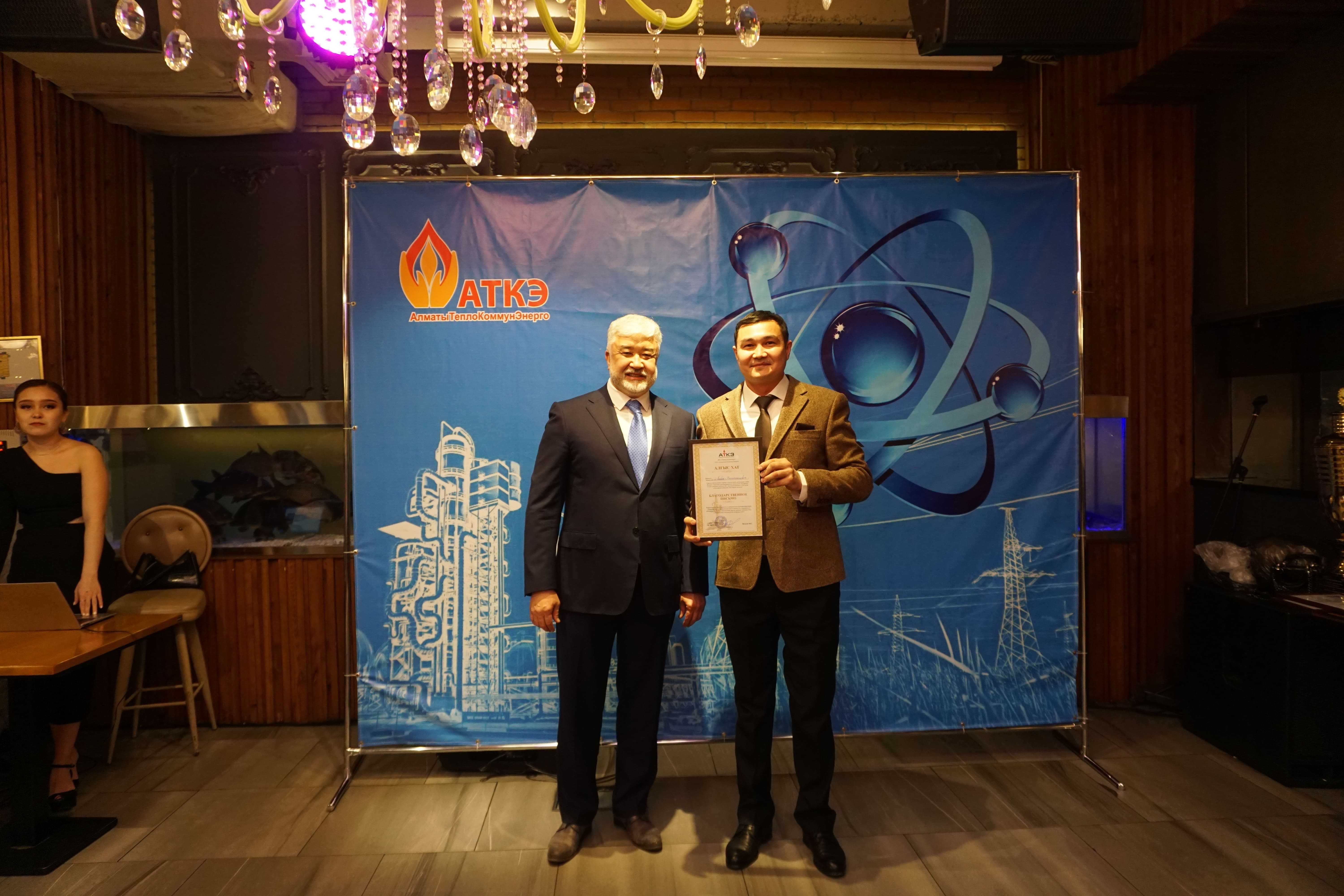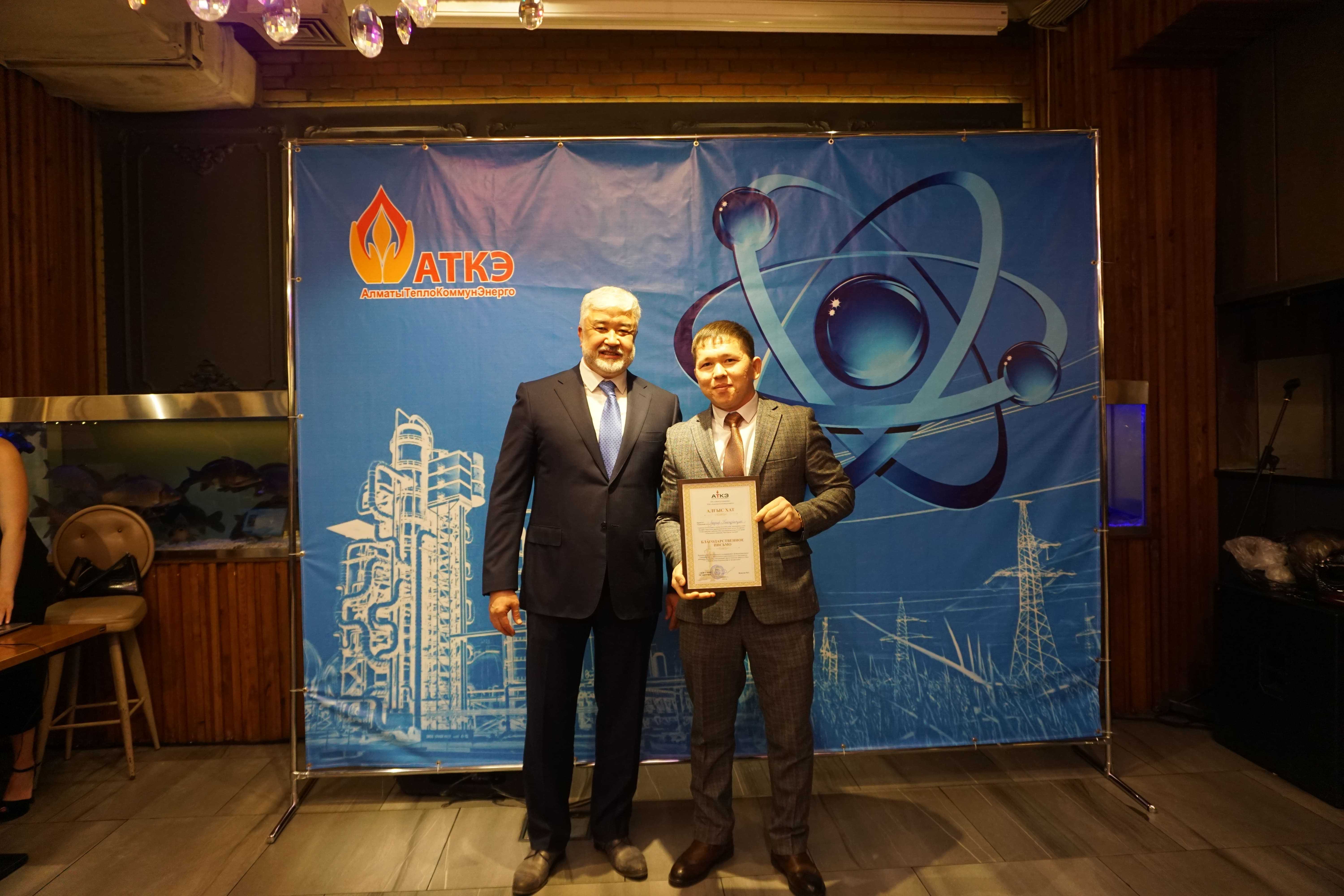 На церемонии были вручены нагрудные знаки РК от Министерства энергетики «Еңбек сіңірген энергетик», «Құрметті энергетик», почетные грамоты и благодарственные письма от акимата города Алматы , КГУ «Управления энергетики и водоснабжения г. Алматы» и ТОО “Алматытеплокоммунэнерго”. Поздравили и наградили сотрудников за высокое профессиональное мастерство и личный вклад в развитие предприятия руководитель управления энергетики и водоснабжения города Алматы -Алин С.М. , генеральный директор ТОО “АТКЭ”- Жунусов М.С. , главный инженер ТОО “АТКЭ” - Дюсенов С.О., заместитель генерального директора по экономике и финансам ТОО “АТКЭ” - Иппергенов Т.С., заместитель генерального директора по обеспечению производства ТОО “АТКЭ” - Нугарбеков Д.К., Заместитель главного инженера ТОО “АТКЭ” - Леденцов П.А.