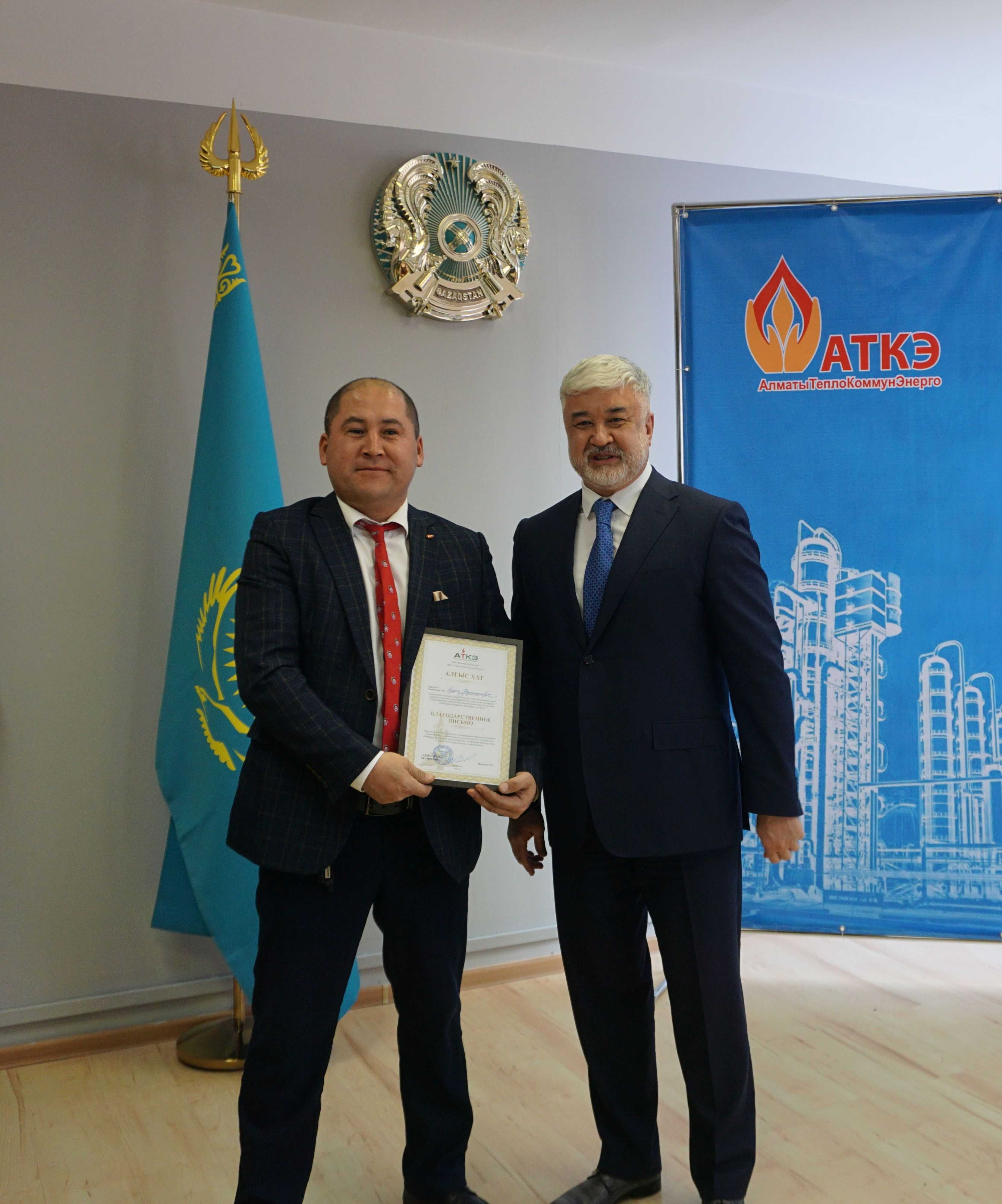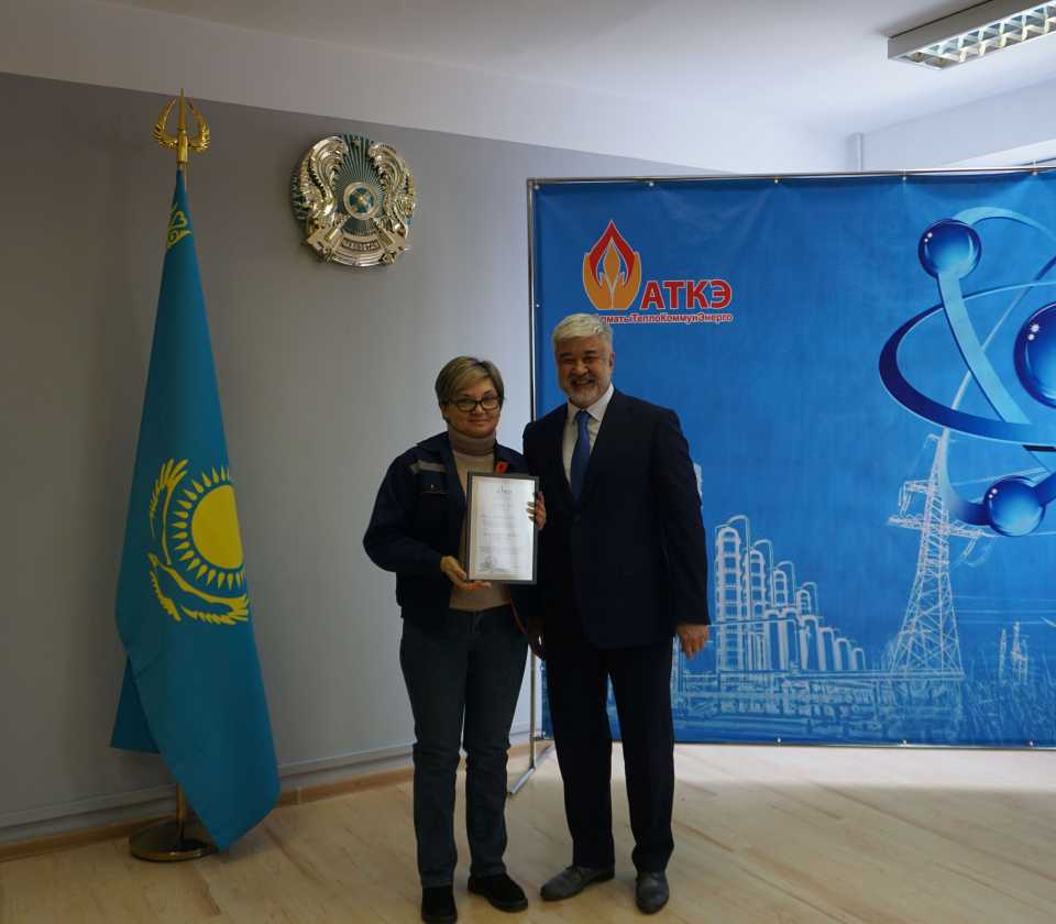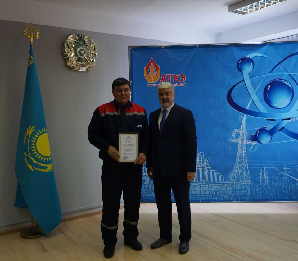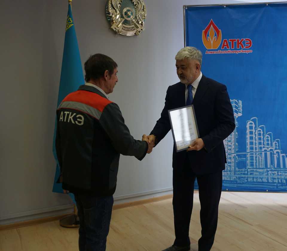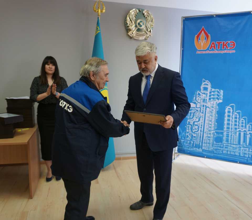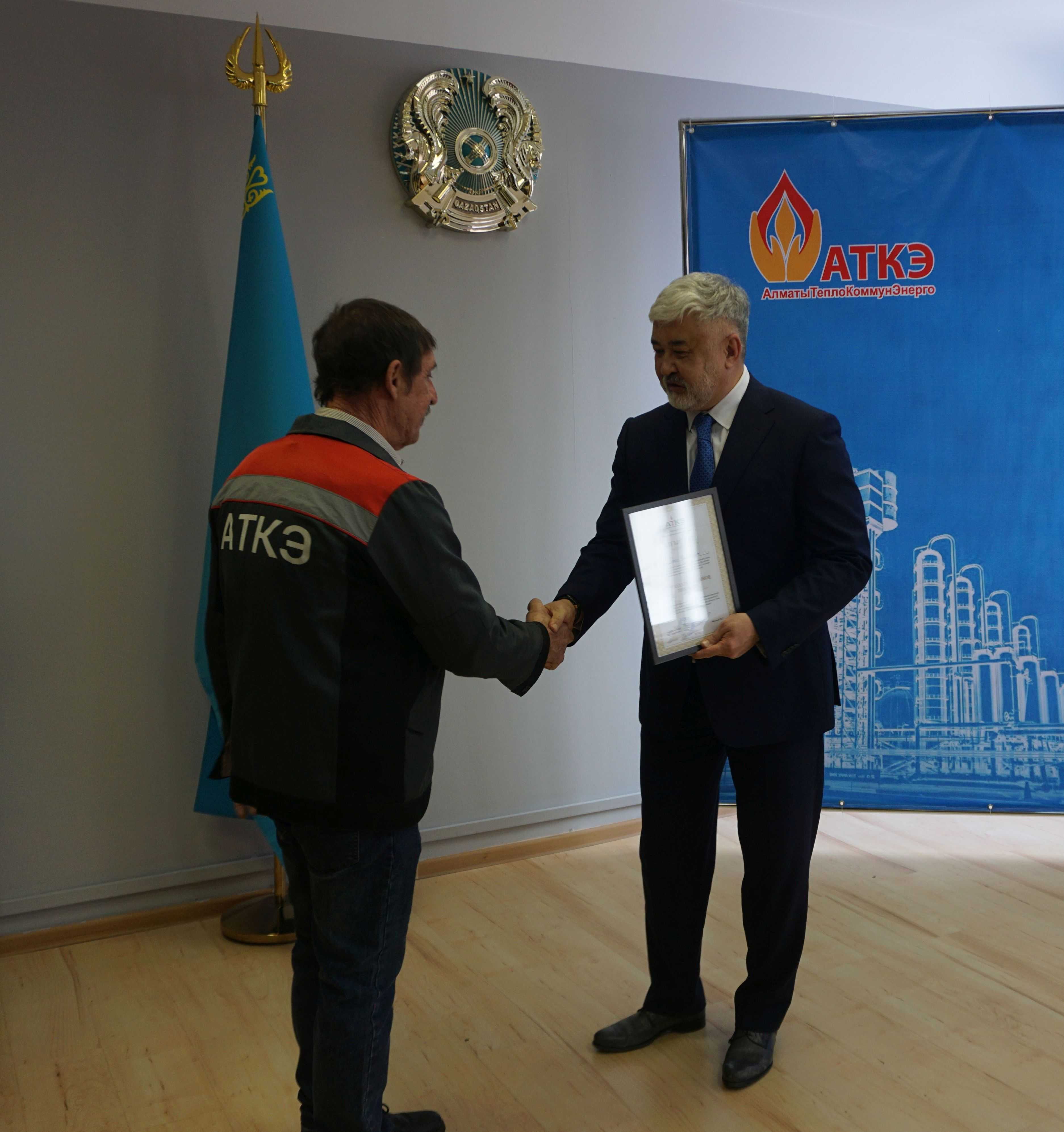 На церемонии были вручены нагрудные знаки РК от Министерства энергетики «Еңбек сіңірген энергетик», «Құрметті энергетик», почетные грамоты и благодарственные письма от акимата города Алматы , КГУ «Управления энергетики и водоснабжения г. Алматы» и ТОО “Алматытеплокоммунэнерго”. Поздравили и наградили сотрудников за высокое профессиональное мастерство и личный вклад в развитие предприятия руководитель управления энергетики и водоснабжения города Алматы -Алин С.М. , генеральный директор ТОО “АТКЭ”- Жунусов М.С. , главный инженер ТОО “АТКЭ” - Дюсенов С.О., заместитель генерального директора по экономике и финансам ТОО “АТКЭ” - Иппергенов Т.С., заместитель генерального директора по обеспечению производства ТОО “АТКЭ” - Нугарбеков Д.К., Заместитель главного инженера ТОО “АТКЭ” - Леденцов П.А.