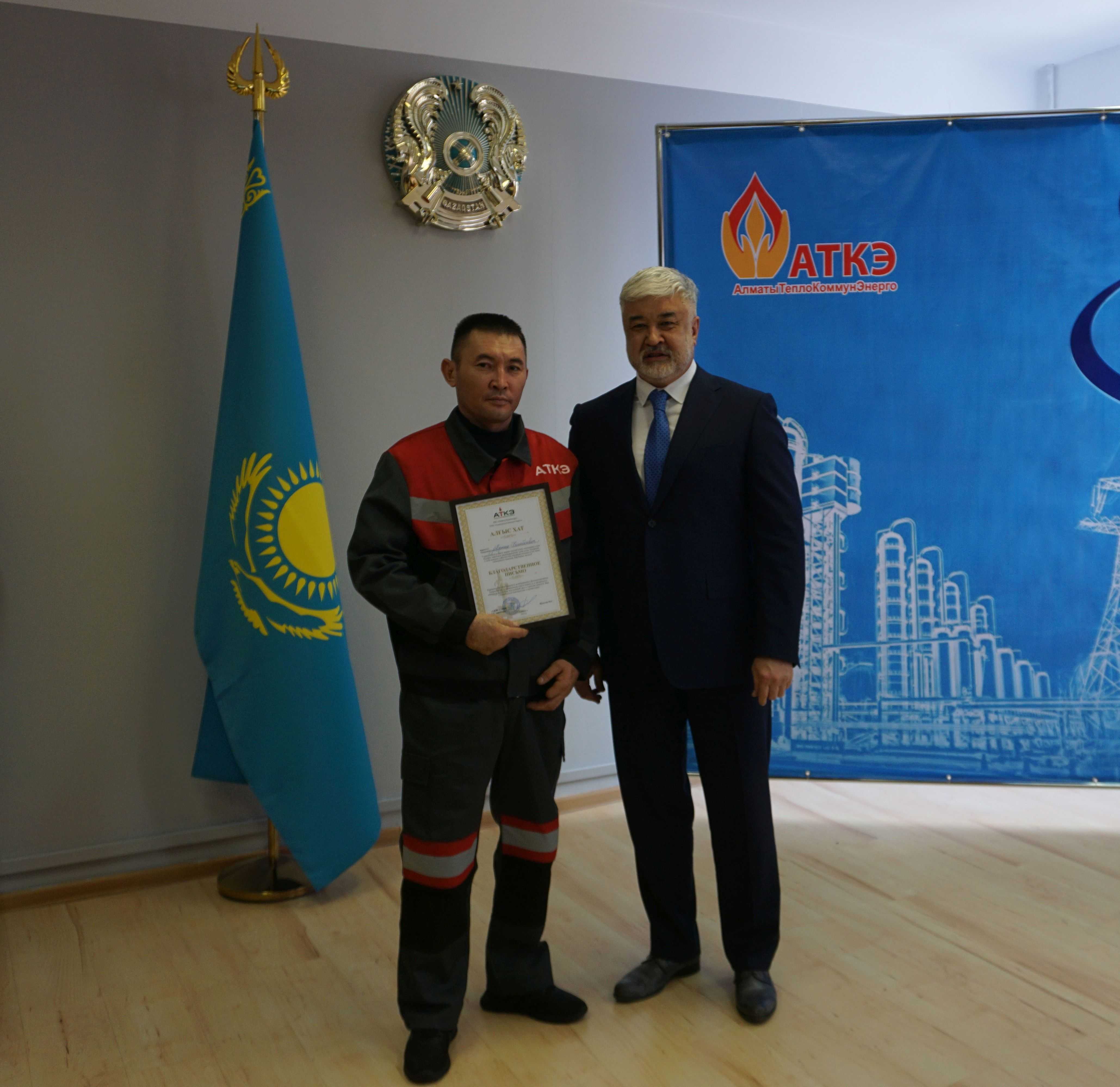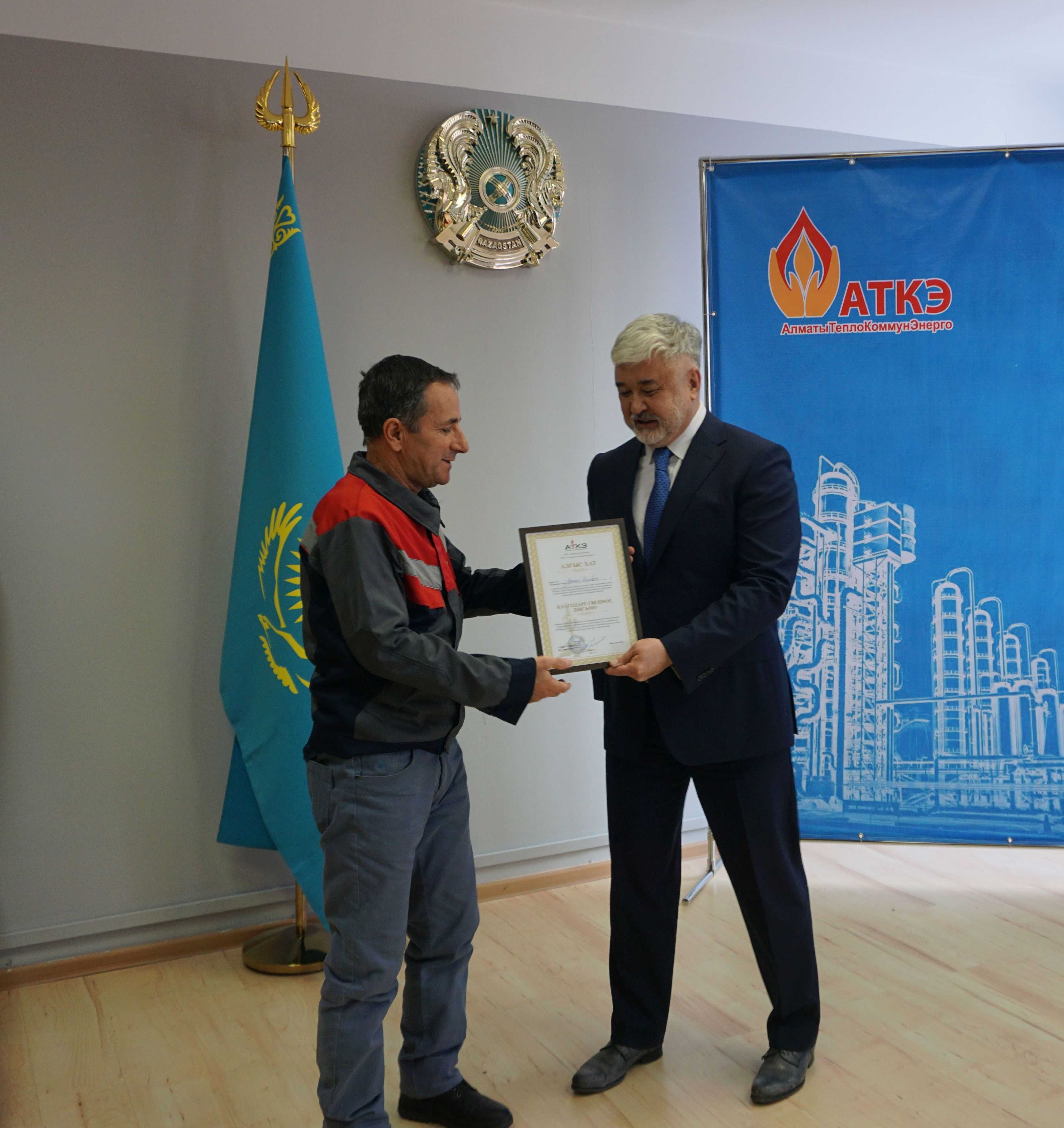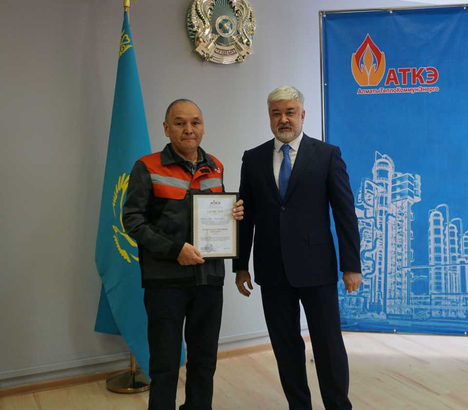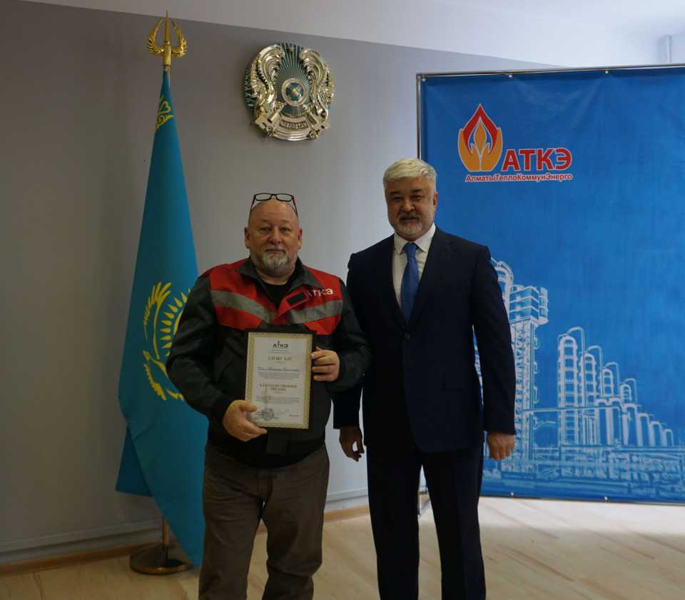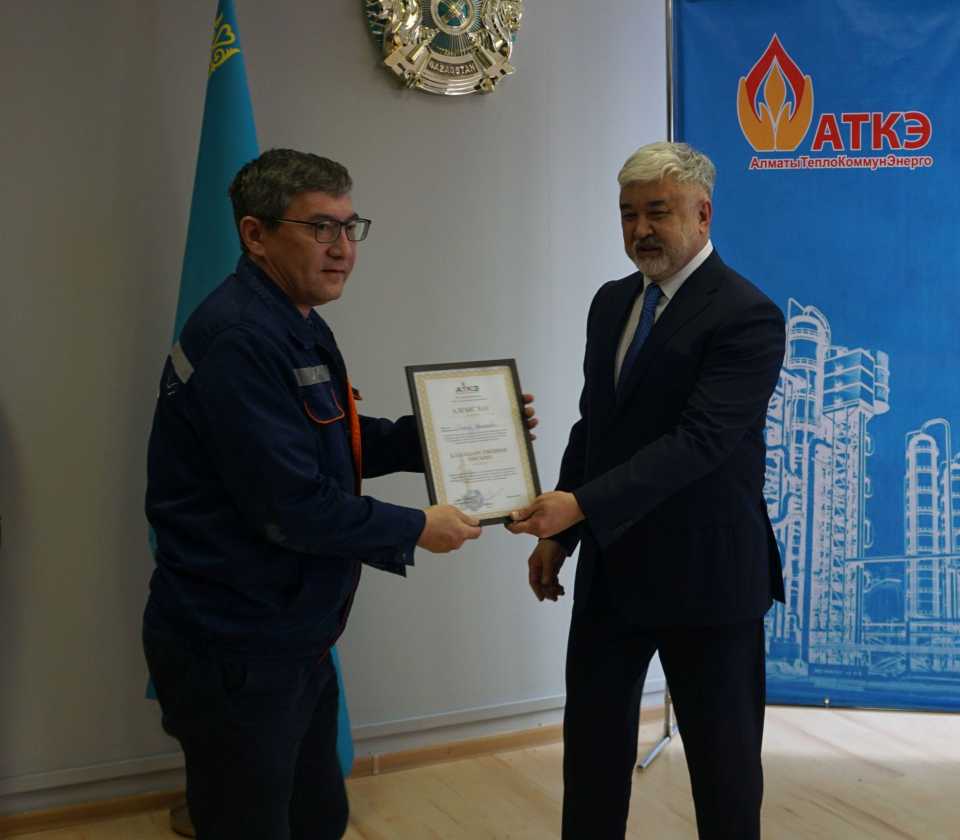 На церемонии были вручены нагрудные знаки РК от Министерства энергетики «Еңбек сіңірген энергетик», «Құрметті энергетик», почетные грамоты и благодарственные письма от акимата города Алматы , КГУ «Управления энергетики и водоснабжения г. Алматы» и ТОО “Алматытеплокоммунэнерго”. Поздравили и наградили сотрудников за высокое профессиональное мастерство и личный вклад в развитие предприятия руководитель управления энергетики и водоснабжения города Алматы -Алин С.М. , генеральный директор ТОО “АТКЭ”- Жунусов М.С. , главный инженер ТОО “АТКЭ” - Дюсенов С.О., заместитель генерального директора по экономике и финансам ТОО “АТКЭ” - Иппергенов Т.С., заместитель генерального директора по обеспечению производства ТОО “АТКЭ” - Нугарбеков Д.К., Заместитель главного инженера ТОО “АТКЭ” - Леденцов П.А.