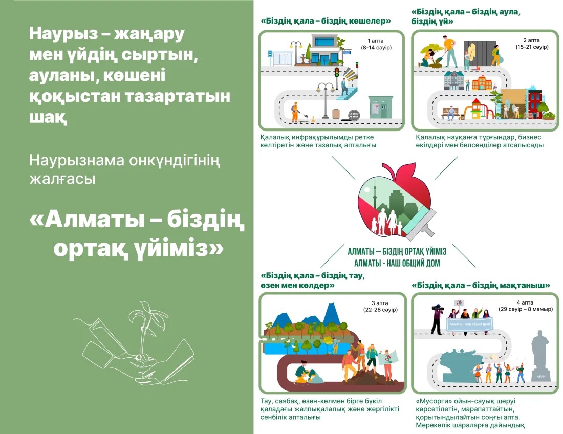 Қаламызда 8 сәуір мен 8 мамыр аралығында «Алматы – біздің ортақ үйіміз» жалпықалалық акциясы өткізілуде, оның міндеті тұрғындар арасында қала инфрақұрылымы мен қоғамдық меншікке жауапкершілікпен қарауды қалыптастыру, жеке экологиялық бастамаларды қолдау, және оларды жүзеге асыруға жағдай жасау, халық арасында жоғары азаматтық жауапкершілік пен экологиялық мәдениетті тәрбиелеу. Акция аясында қаланың барлық аудандарында қоқыс шығару, қалалық инфрақұрылымды тазалау және жаппай ағаш отырғызу жұмыстары жүргізілуде.