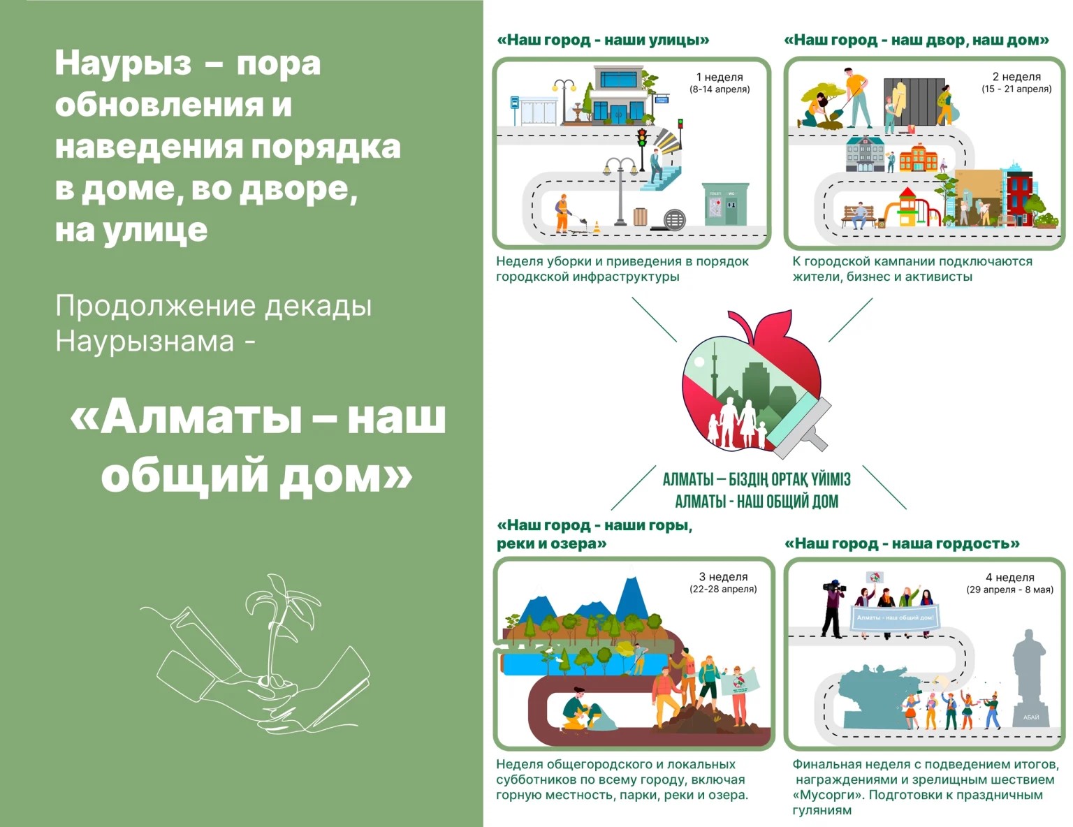 В нашем городе с 8 апреля по 8 мая проводится общегородская кампания «Алматы – наш общий дом», задача которой сформировать у его жителей ответственное отношение к городской инфраструктуре и общественному имуществу, поддержать частные экологические инициативы, и создать условия для их реализации, воспитать высокую гражданскую ответственность и экологическую культуру среди населения.