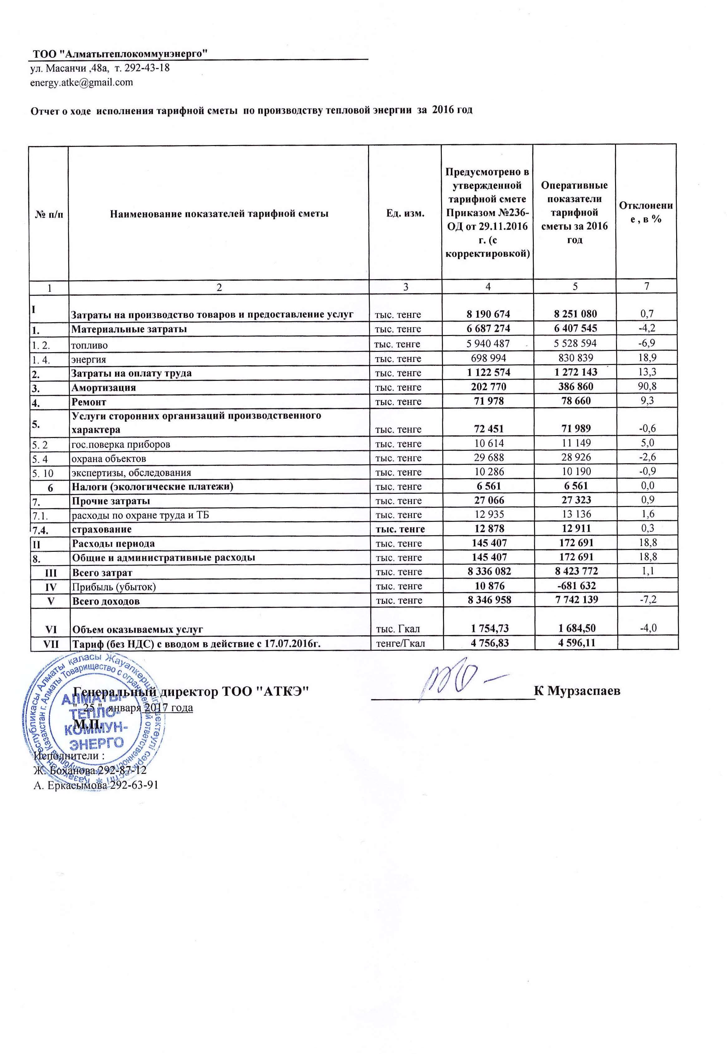 Отчет о ходе исполнения тарифной сметы по производству тепловой энергии за 2016 год