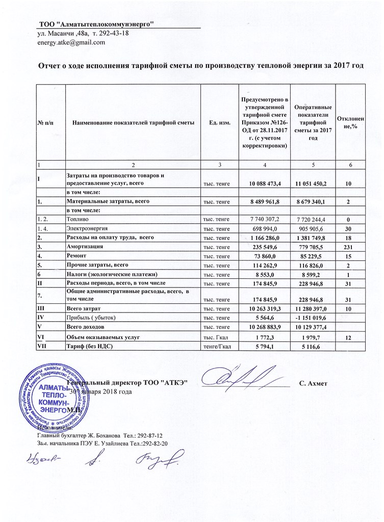Отчет о ходе исполнения тарифной сметы по производству тепловой энергии за 2017 год