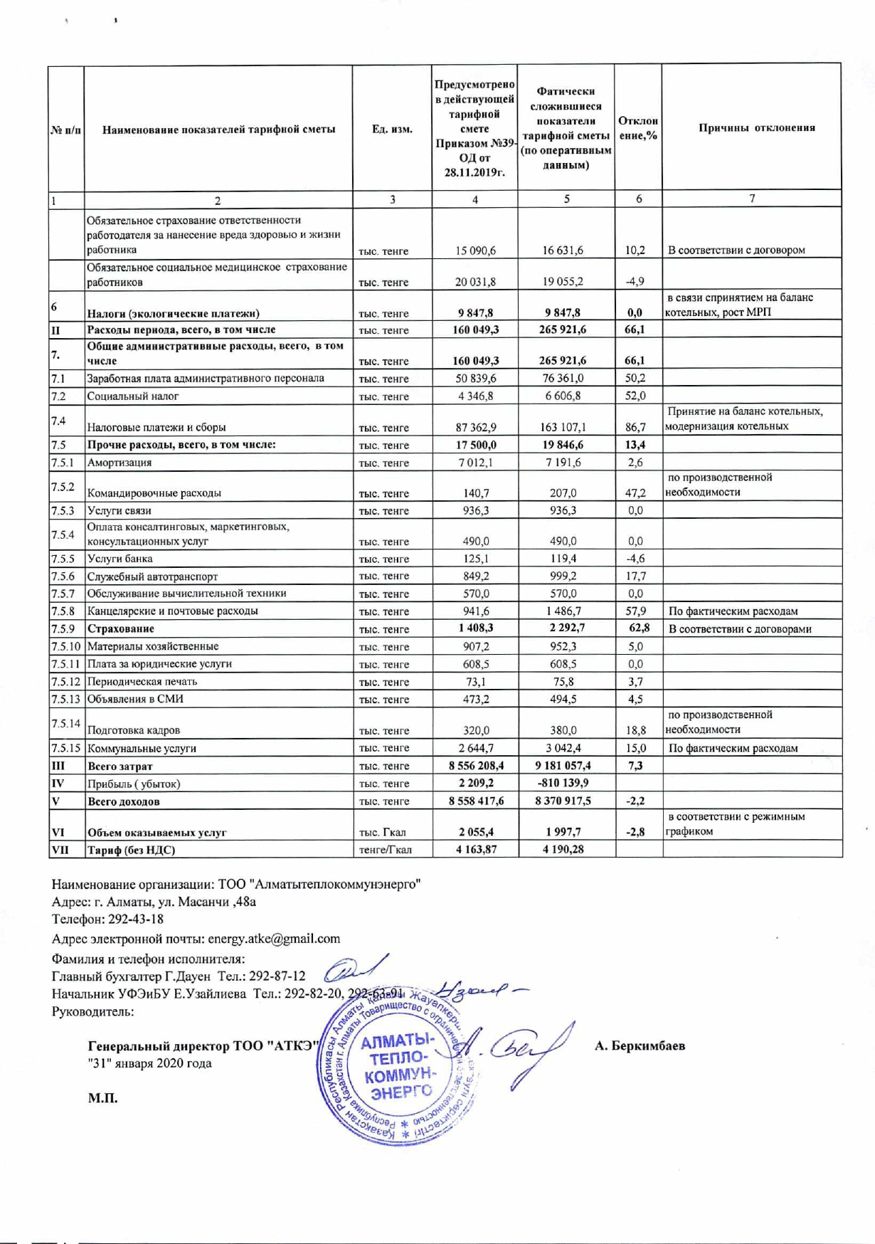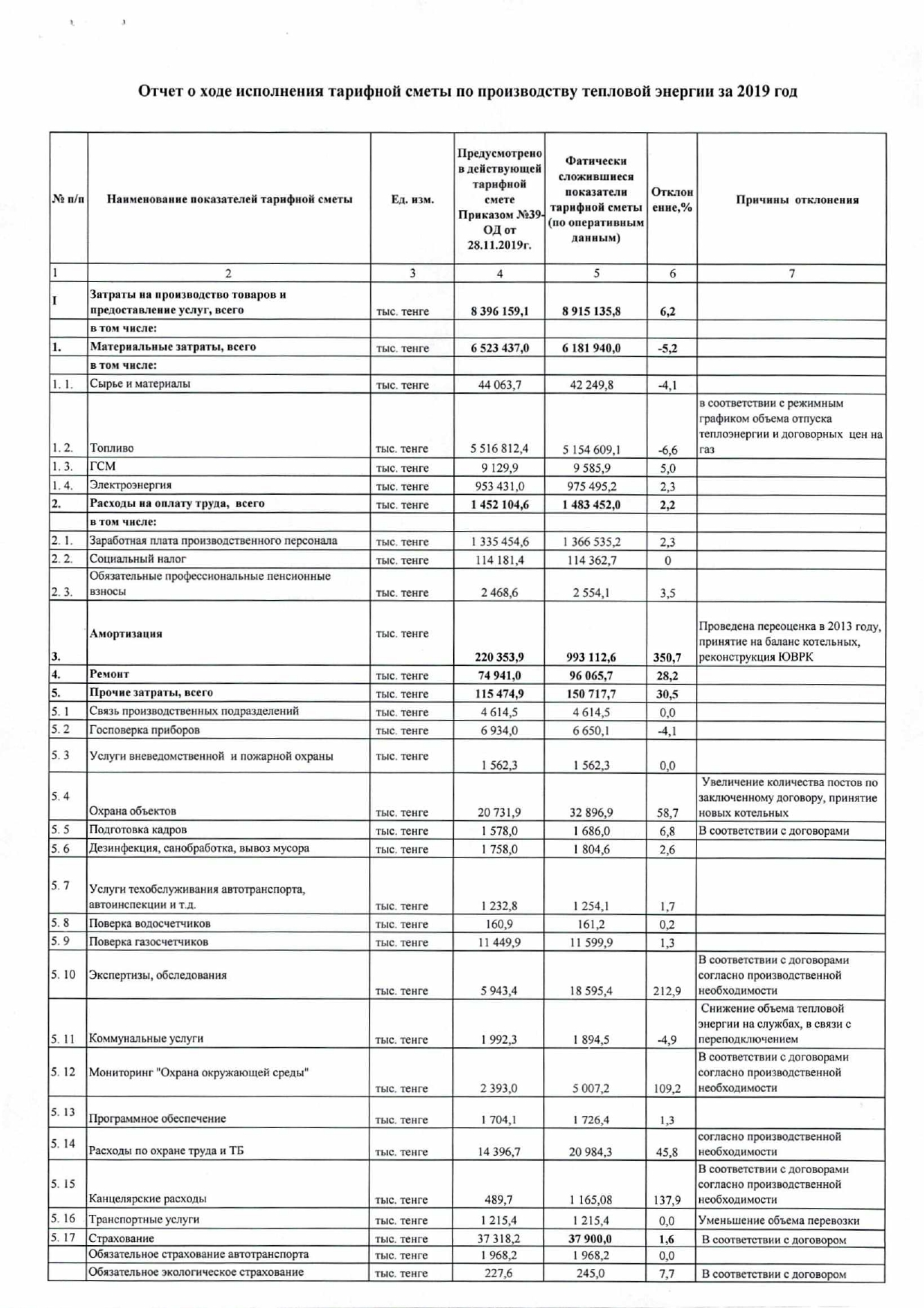 Отчет о ходе исполнения тарифной сметы по производству тепловой энергии за 2019 год