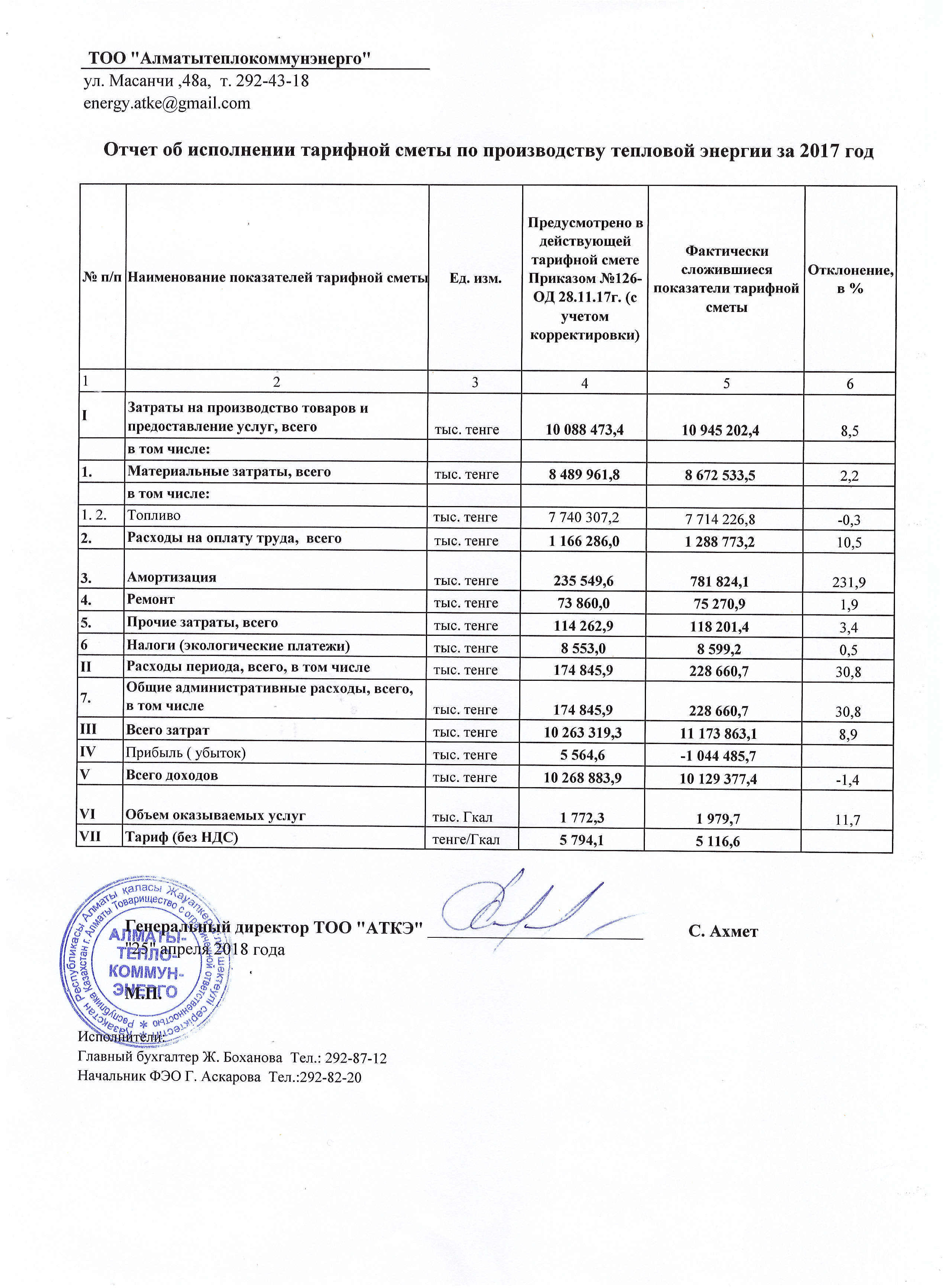 Отчет об исполнении тарифной сметы по производству тепловой энергии за 2017 год