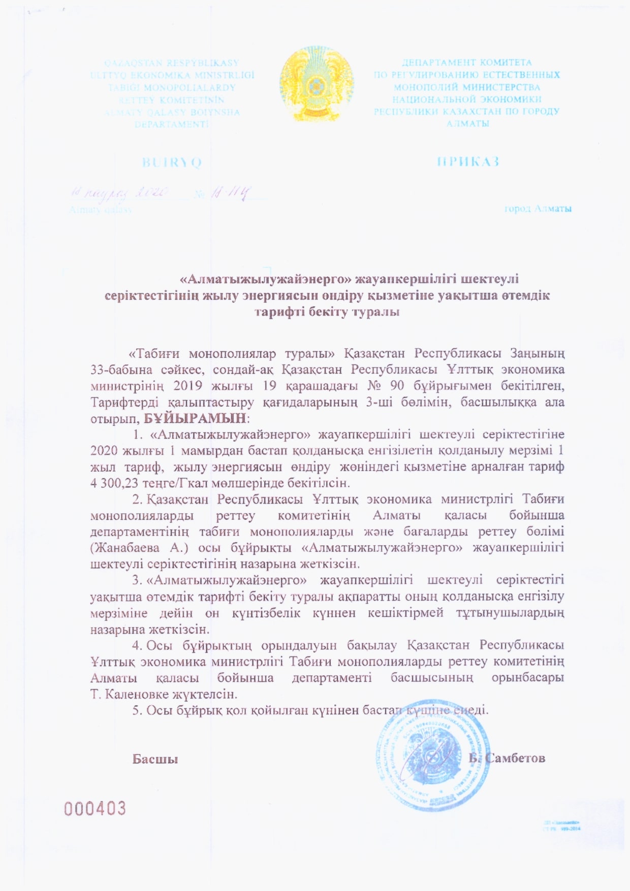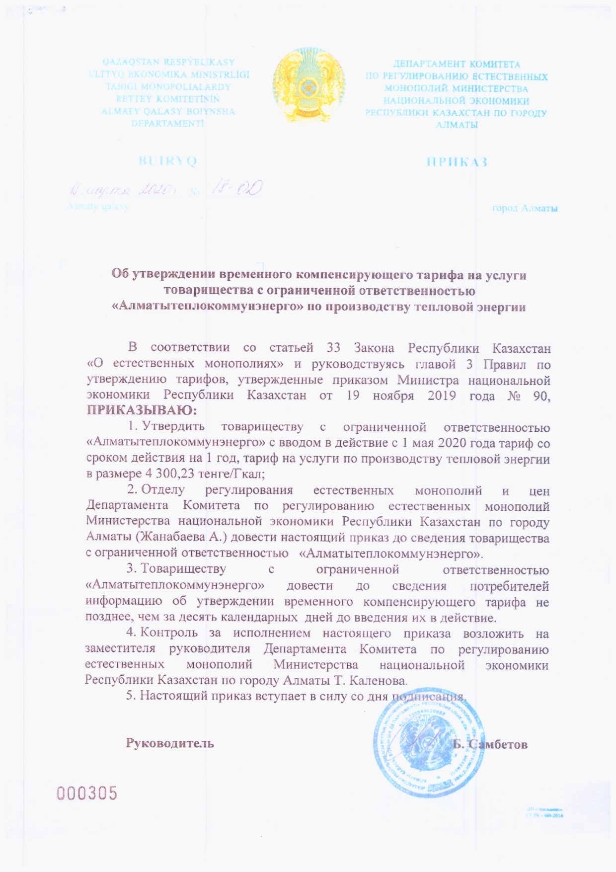 ТОО «Алматытеплокоммунэнерго» извещает потребителей о снижении тарифа по производству тепловой энергии, с учетом приказа Департамента Комитета по регулированию естественных монополий Министерства национальной экономики Республики Казахстан по городу Алматы от 18.03.2020 года №18-ОД «Об утверждении временного компенсирующего тарифа на услуги по производству тепловой энергии», с вводом в действие с 1 мая 2020 года в размере 4 300,23 тенге/Гкал (без учета НДС).