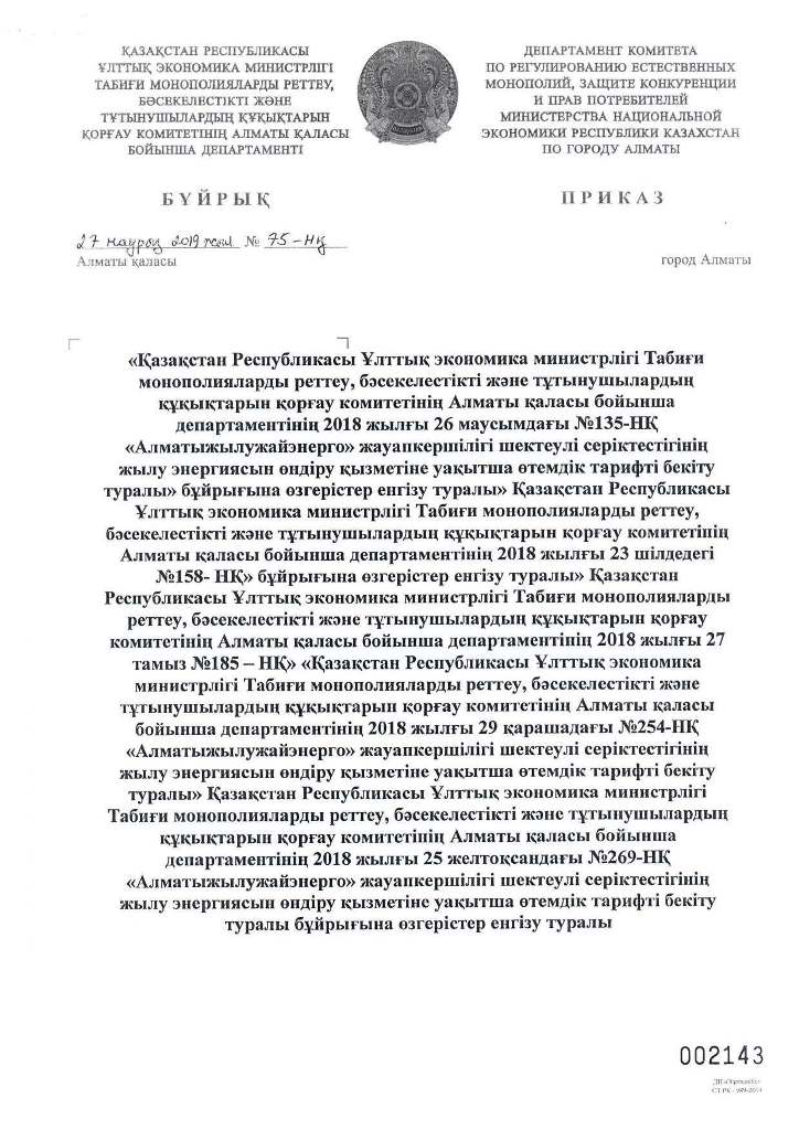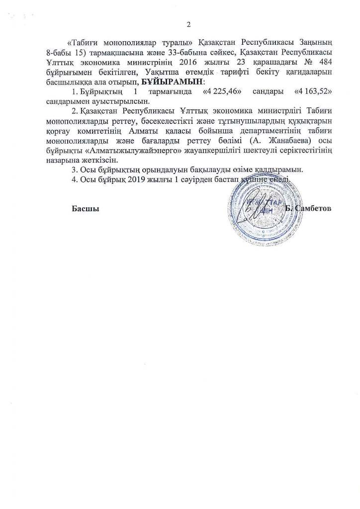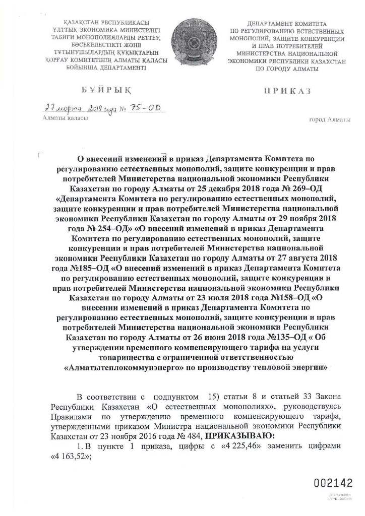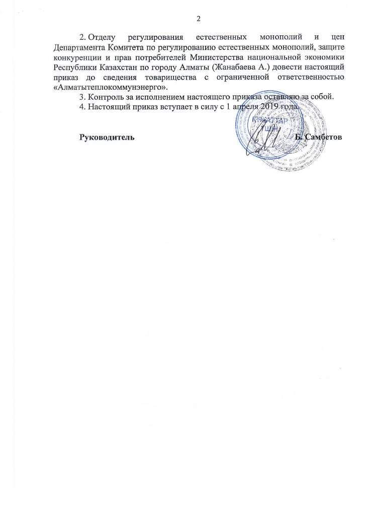 ТОО «Алматытеплокоммунэнерго» извещает потребителей о снижении тарифа по производству тепловой энергии, с учетом приказов Департамента Комитета по регулированию естественных монополий, защите конкуренции и прав потребителей Министерства национальной экономики Республики Казахстан по городу Алматы от 27 марта 2019 года №75-ОД «Об утверждении временного компенсирующего тарифа на услуги по производству тепловой энергии», с вводом в действие с 1 апреля 2019 года в размере 4 163,52 тенге/Гкал (без учета НДС).